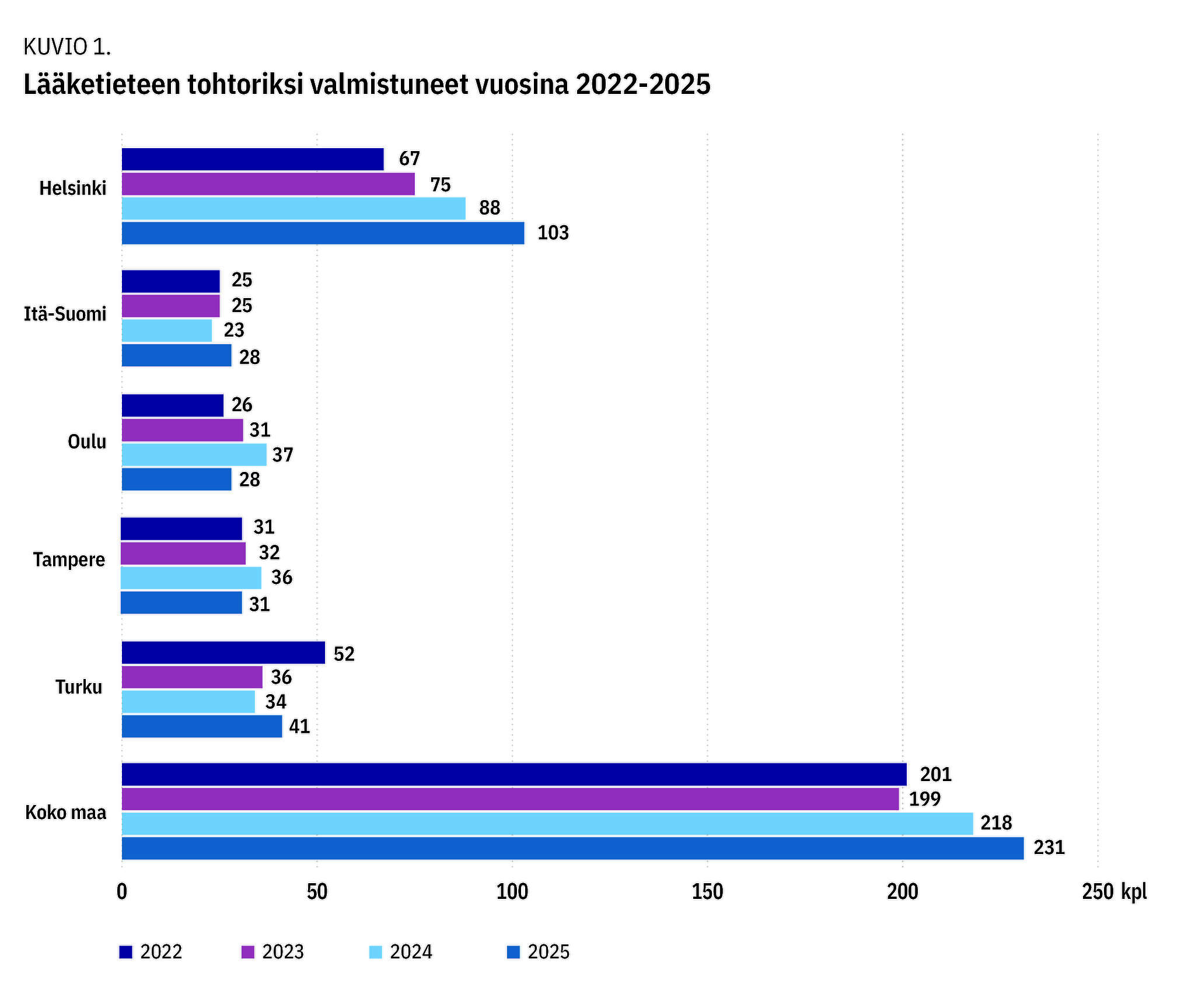 Lääkärilehti kysyi lääkäreitä kouluttavilta yliopistoilta valmistuneiden väitösten määrät vuosilta 2022–2025. Yliopistojen antamien tietojen mukaan uusia lääketieteen tohtoreita valmistui viime vuonna yhteensä 231. Se on 30 enemmän kuin vuonna 2022.