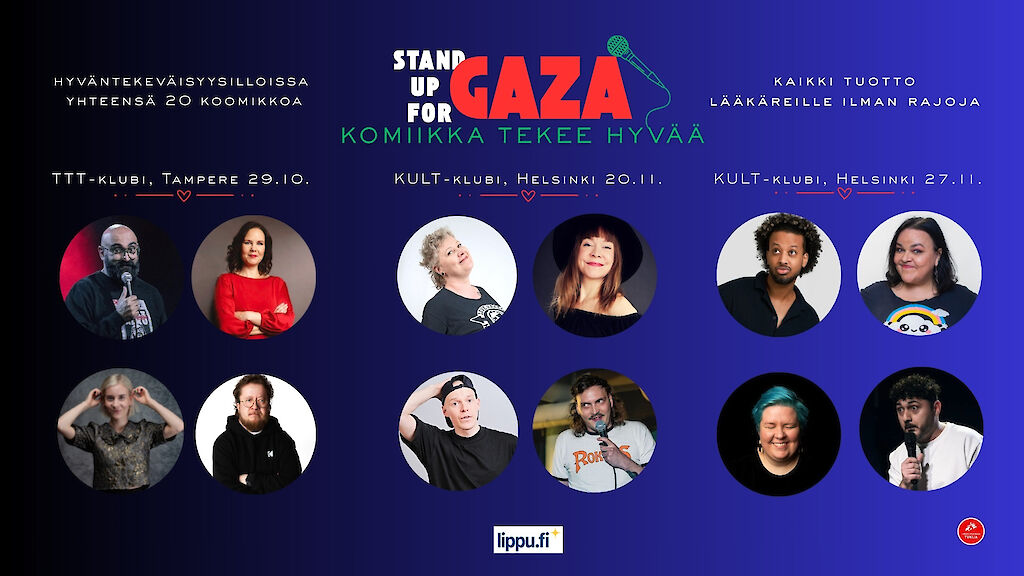 Viihdetaiteilijat päättivät yhdistää voimansa ja esiintyä Helsingissä ja Tampereella Gazan hyväksi stand up -illoissa. Lääkärit Ilman Rajoja saa esitysten tulot.