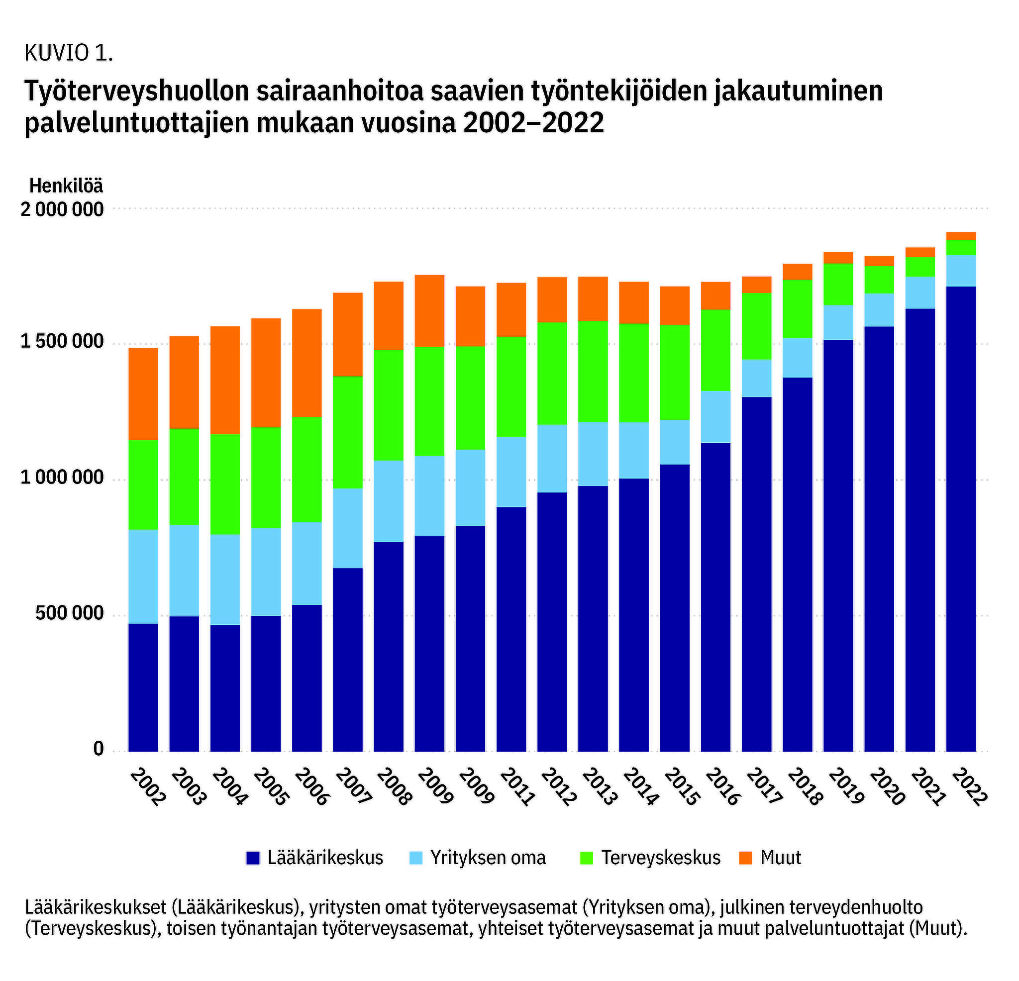 Työterveyshuoltolaki uudistettiin vuonna 2001. Samanaikaisesti Kela muutti työterveyshuollon vuosiraportointia. Sitä ennen yksityiset lääkärikeskukset raportoitiin ryhmässä ”muut” yhdessä tuolloin yleisten valtion omien työterveysasemien kanssa. Yrittäjät voivat hakea korvausta joko työnantajina tai yrittäjinä (4). Vuonna 2022 yrittäjät hakivat selvästi alle prosentin kaikista korvauksista ja kustannuksista, joten ne jätettiin tarkastelun ulkopuolelle.