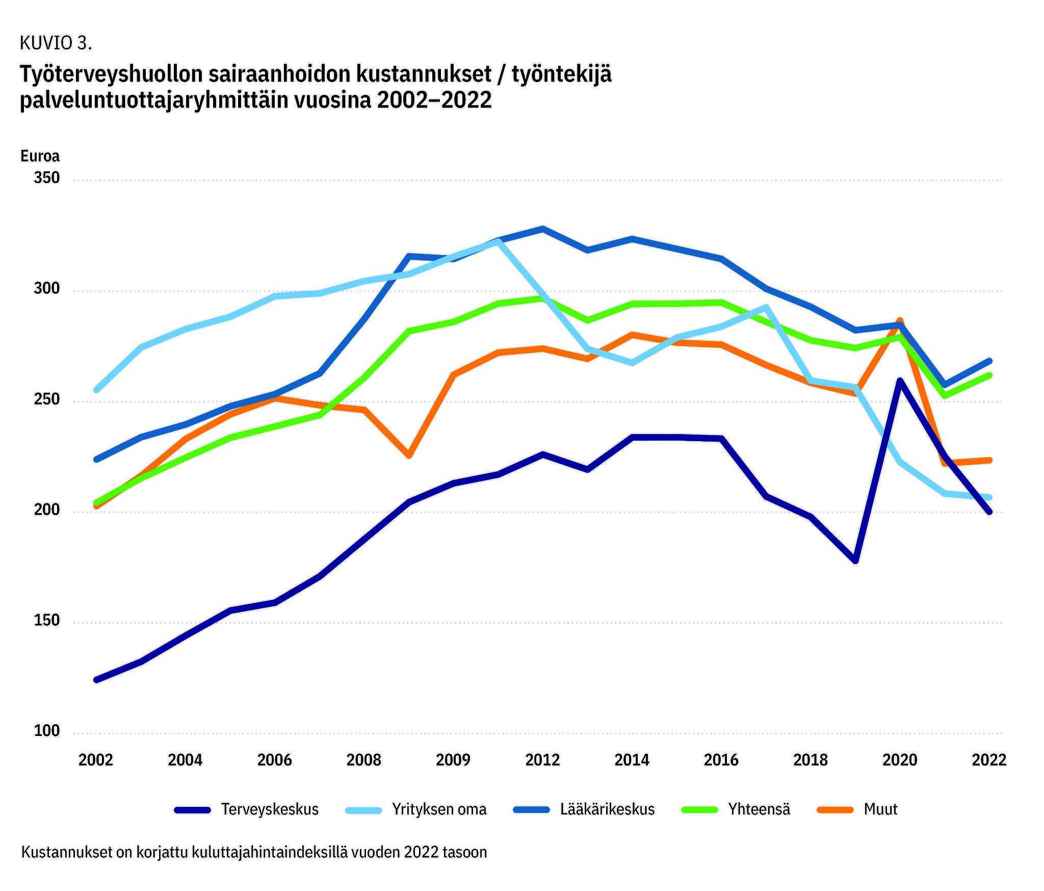 Results The share of workers receiving their services from private medical centers increased from 32 % to almost 90 % during the follow-up period. At the same time, the share of physicians in service production increased. The number of appointments started to decrease after 2010, turning to a slight increase in 2022. The cost increase leveled off after 2010, especially compared to the number of people and value for money.