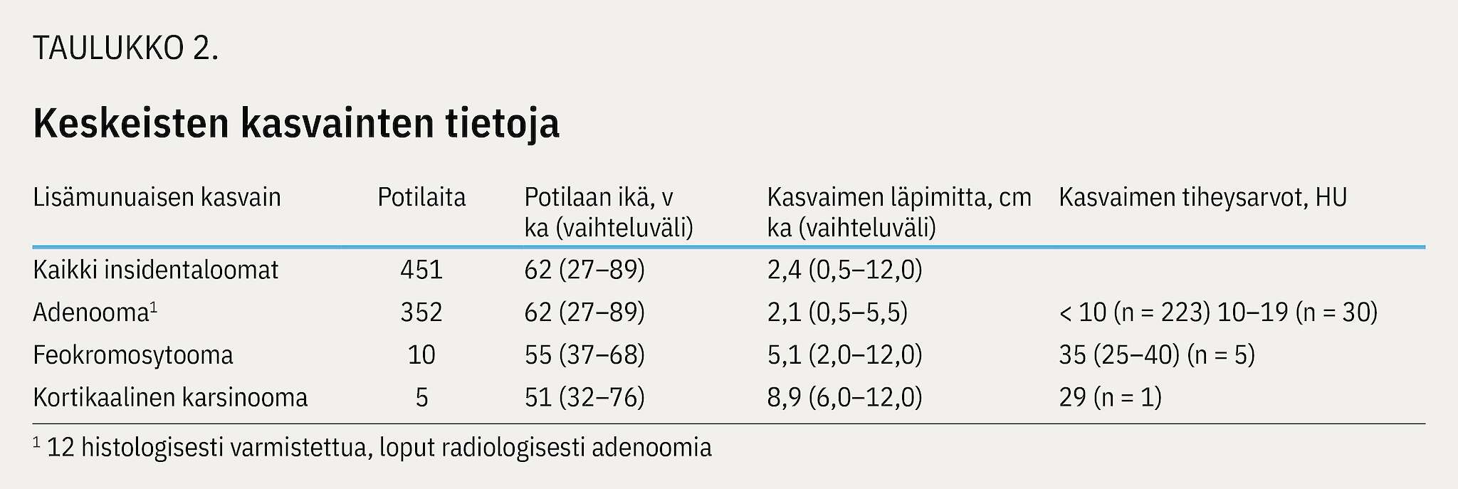 Tulokset Adenoomia oli 352 (78,0 %), feokromosytoomia 10 (2,2 %), kortikaalisia karsinoomia 5 (1,1 %) ja etäpesäkkeitä 6 (1,3 %). Adenoomat olivat läpimitaltaan keskimäärin 2,1 cm (0,5–5,5 cm). Alle 20 Hounsfieldin yksikön tiheyksisistä kasvaimista ei löytynyt yhtään pahanlaatuista primaarikasvainta. TT-kuvauksessa adenoomiksi lausutut kasvaimet eivät kasvaneet tai osoittautuneet seurannassa pahanlaatuisiksi potilailla, joilla ei ollut syöpähistoriaa.