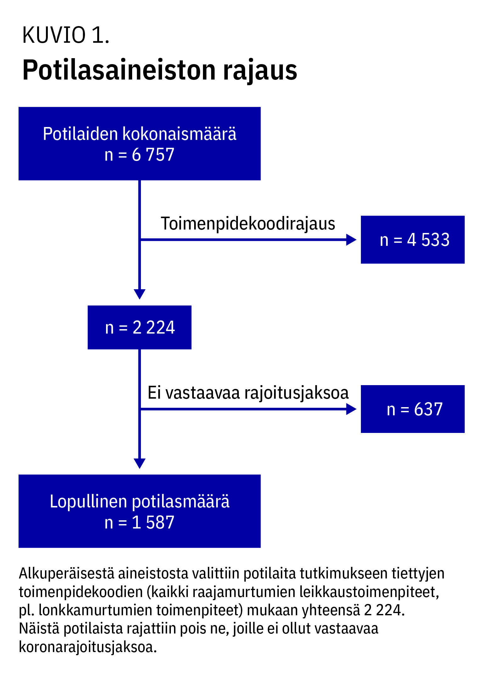 Menetelmät Aineistona käytettiin Taysin ortopedisen yksikön leikkaustietoja vuosilta 2018–2022. Tutkimukseen sisällytettiin yhteensä 1 587 potilasta. Tutkimusjaksona käytettiin ajankohtia, jolloin oli voimassa ravintolatoiminnan rajoituksia: 4.4.2020–12.7.2020, 9.3.2021–18.4.2021 ja 7.1.2022–14.2.2022. Verrokkijaksona käytettiin koronaa edeltävää vuodenaikakaltaistettua jaksoa vuosilta 2018–2019.