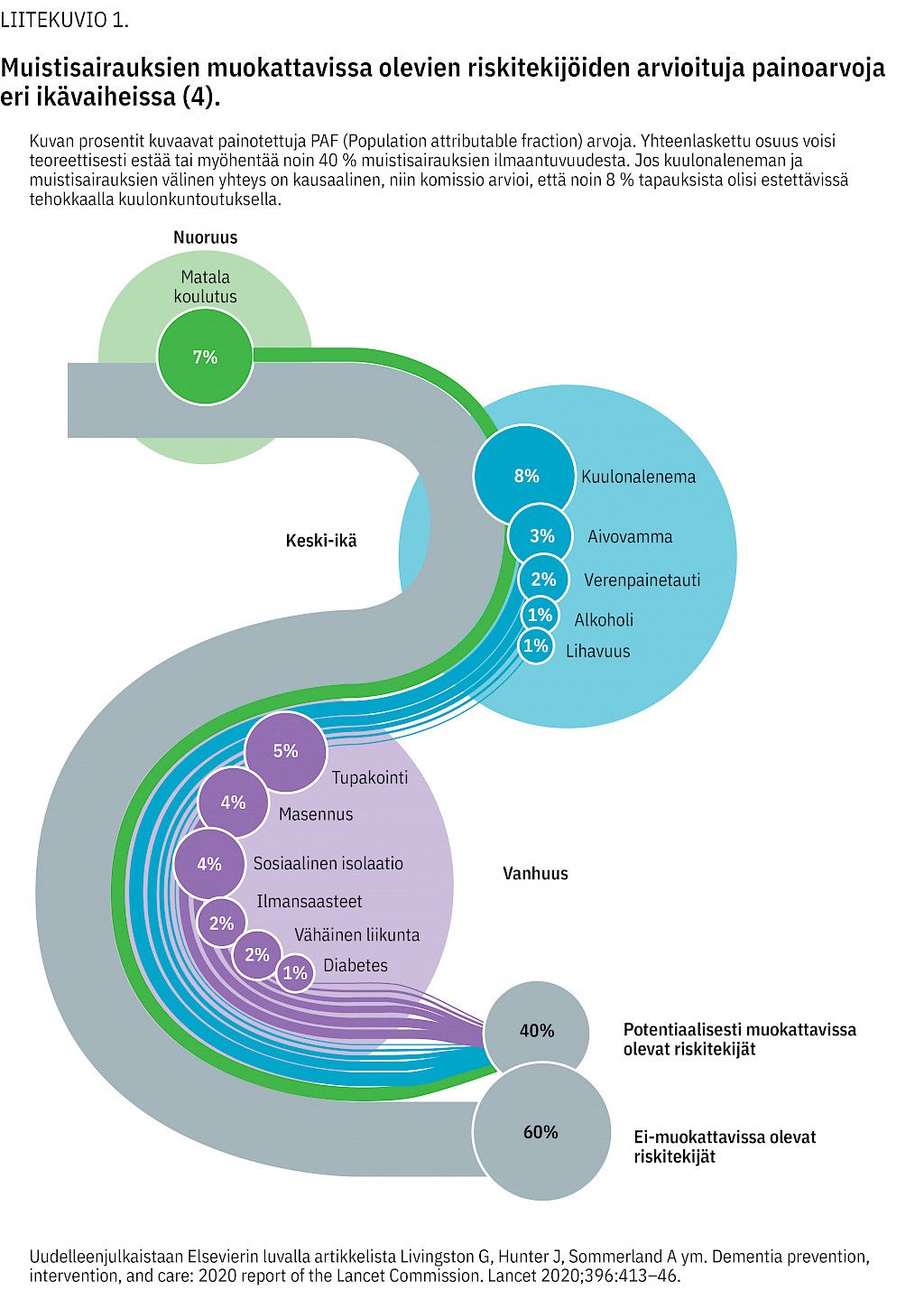 Lancet-komissio tunnisti 12 mahdollisesti muunnettavissa olevaa dementian riskitekijää. Näistä kuulonalenemaa pidettiin yhtenä merkittävimpänä erityisesti keski-ikäisillä (liitekuvio 1). Kuvion prosentit kuvaavat painotettuja PAF (population attributable fraction) -arvoja, joiden yhteenlaskettu osuus voisi teoreettisesti estää tai myöhentää noin 40 % muistisairauksien ilmaantuvuudesta.