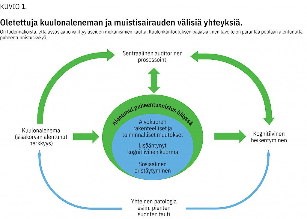 Kuulonalenemaan tiedetään liittyvän suurentunut riski sosiaaliseen eristäytymiseen (25). Tämä on tunnettu itsenäinen muistisairauden riskitekijä (26). On kuitenkin todennäköistä, että kuulonaleneman ja muistisairauksien välinen yhteys välittyy usean eri mekanismin kautta, osuuksien vaihdellessa yksilöllisesti (kuvio 1) (15,16).