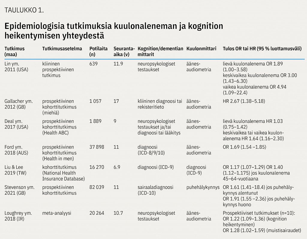 Epidemiologiset tutkimukset ovat yhdenmukaisesti osoittaneet kuulonaleneman yhteyden muistisairauksien riskiin (5,6,7,8,9,10,11) (taulukko 1).