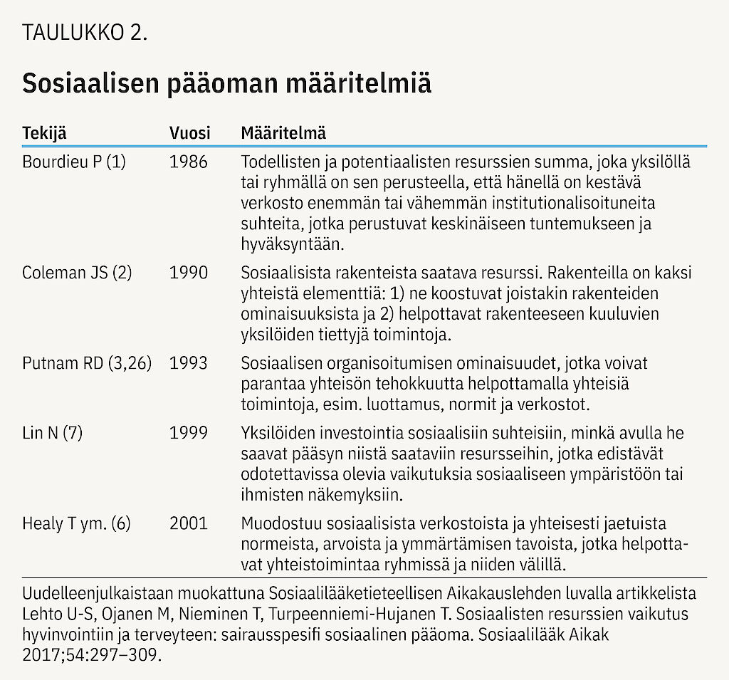 - Lehto U-S, Ojanen M, Nieminen T, Turpeenniemi-Hujanen T. Sosiaalisten resurssien vaikutus hyvinvointiin ja terveyteen: sairausspesifi sosiaalinen pääoma (Social capital in health research: the concept of disease-specific social capital). Sosiaalilääk Aikak 2017;54:297–309.