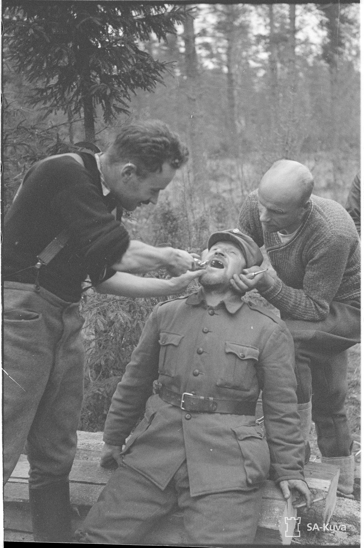 Saurojan kommentit: Kuva on esimerkki siitä, että rintamalla yleislääkärit joutuivat toimimaan myös hammaslääkäreinä. He tekivät mitä moninaisimpia toimia, myös hätäkirurgiaa. Potilaalla on tupakka kädessään. Hän on varman vetänyt hermosauhut ennen kuin hammas vedetään suusta. Lääkäri on ottanut asetakin pois. Alla hänellä on siviilipaita. Se oli kiellettyä, mutta tyypillistä.
