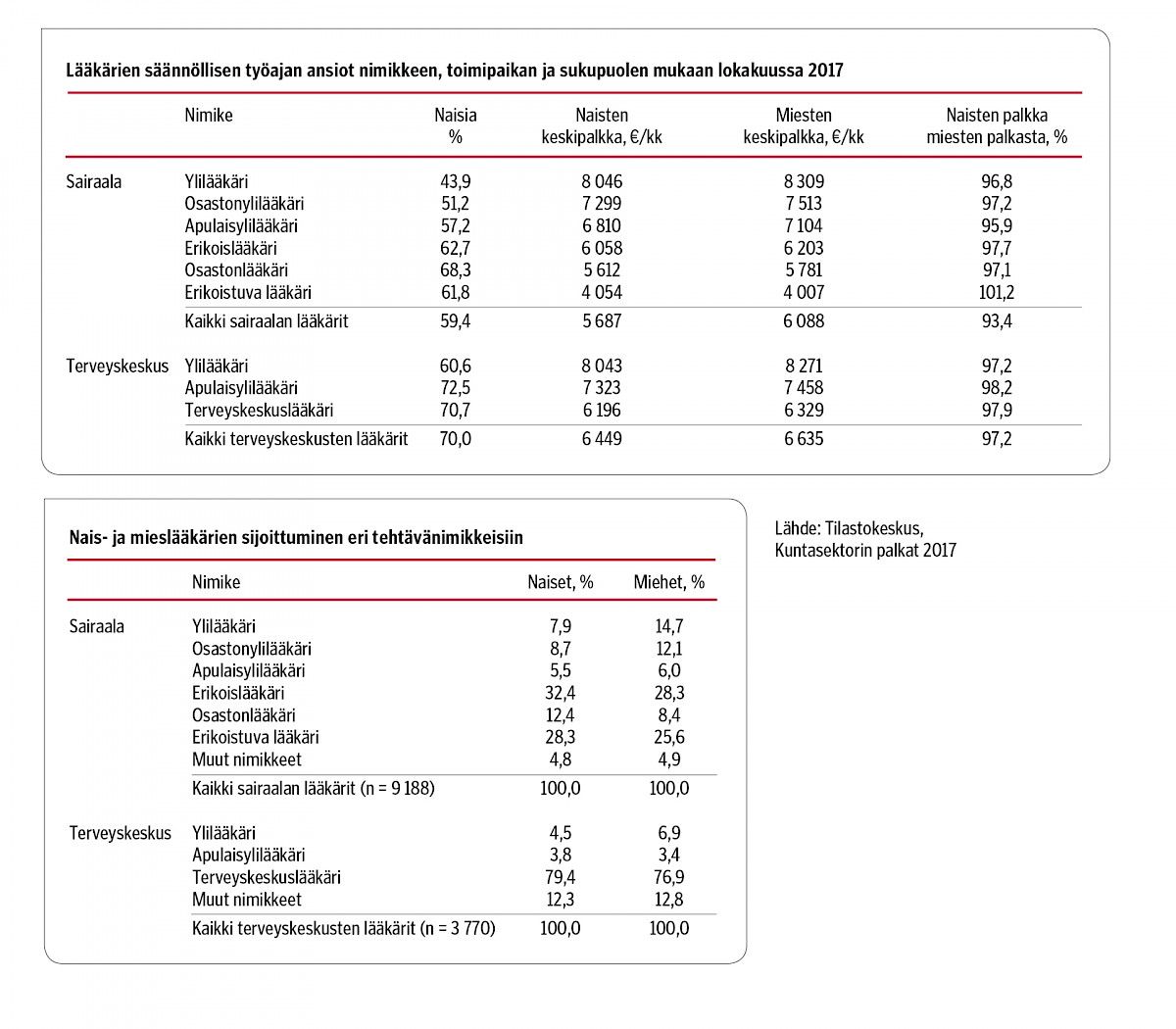 Kuntasektorin nais- ja mieslääkärien palkkaerot ovat pienemmät kuin palkansaajilla keskimäärin. Keskimääräinen palkkaero on noin 15 prosenttia miesten hyväksi, ja tehtäviin sijoittuminen huomioiden ero kaventuu alle 10 prosenttiin.