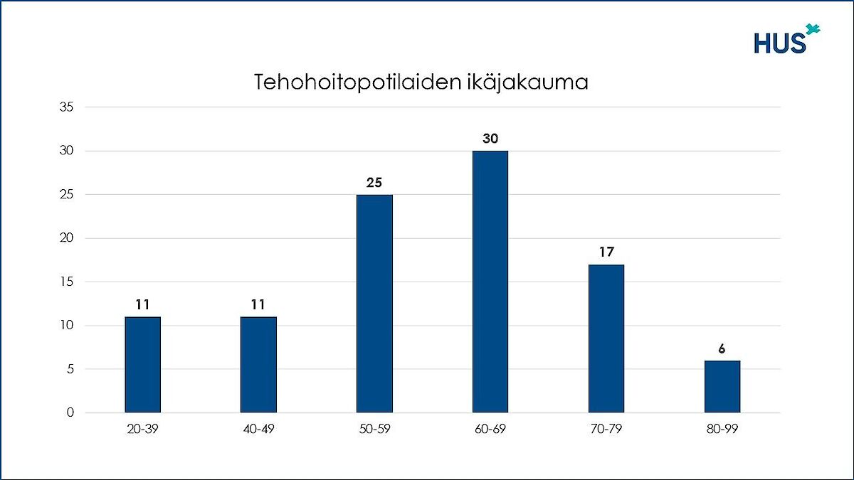 30 potilasta on ollut iältään 60–69-vuotiaita. Iältään 50–59-vuotiaita potilaita on ollut tehohoidossa 25.