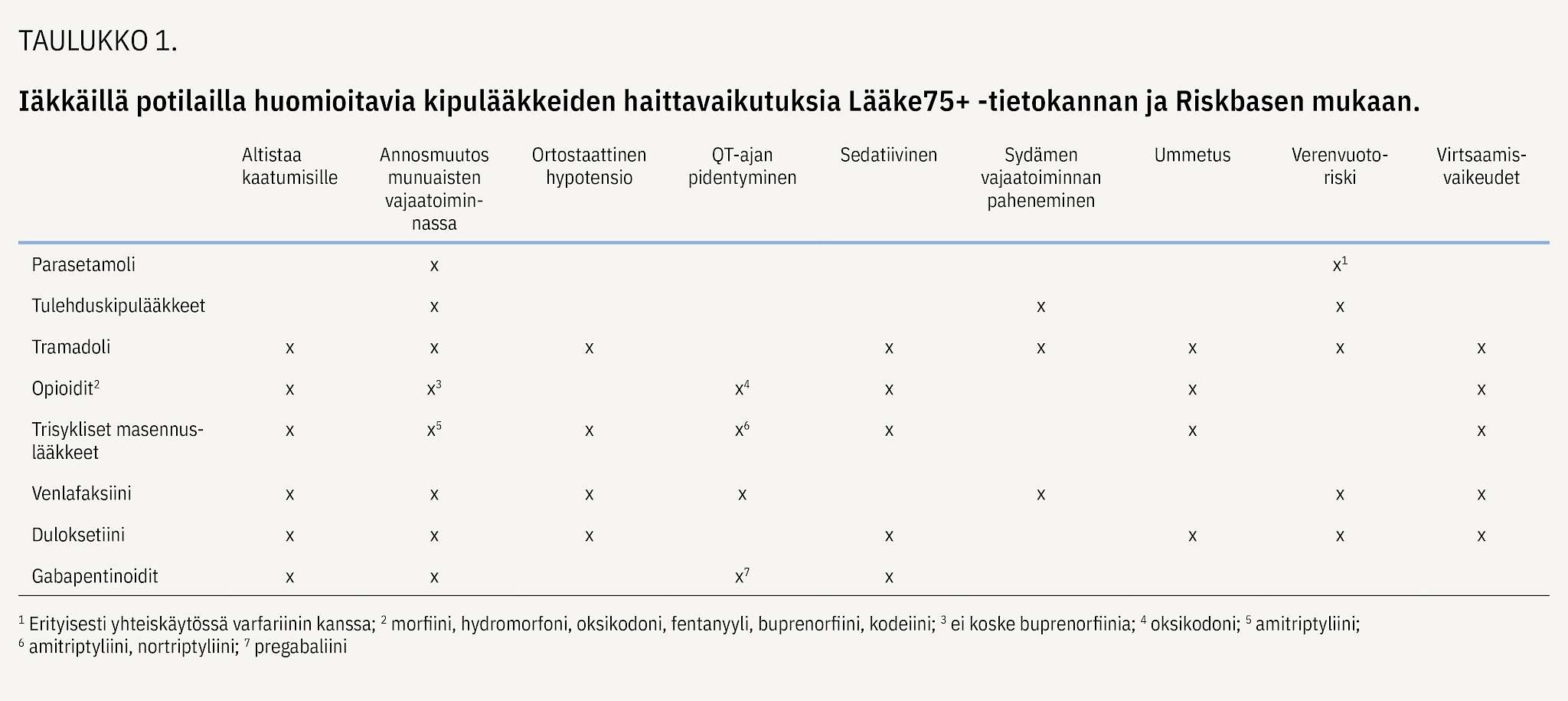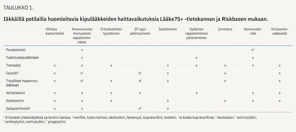 Lääkkeen ja sen annoksen valinnassa on otettava huomioon, että ikääntynyt elimistö on herkkä kipulääkkeiden haitallisille vaikutuksille. Lääke75+ on tietokanta, joka tiivistää tärkeimmät iäkkäillä potilailla huomioitavat seikat lääkeainekohtaisesti.