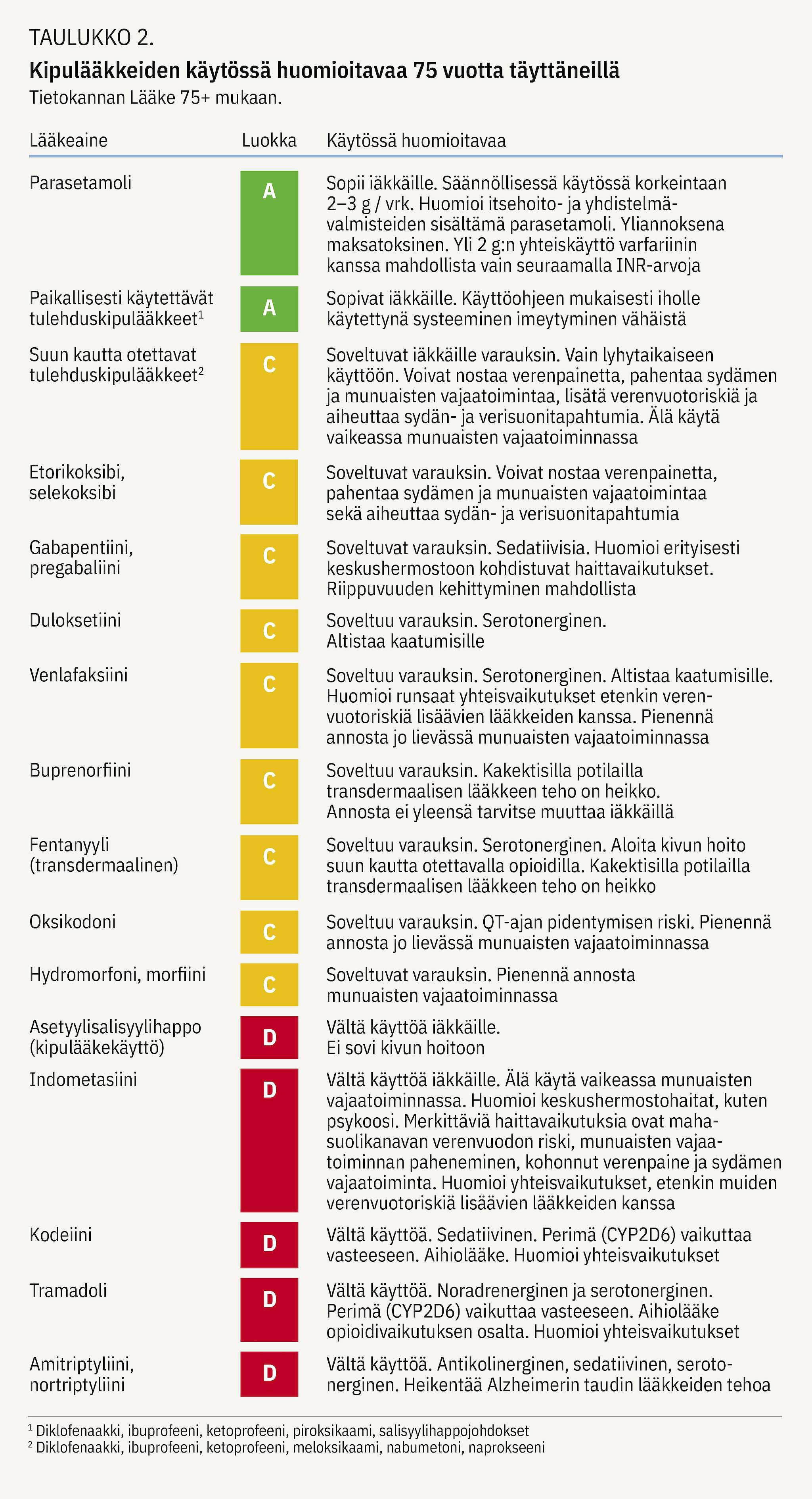 Asiantuntijaryhmä luokittelee valmisteet lääkeainekohtaisesti iäkkäille potilaille sopiviksi (A), varauksin soveltuviksi (C) tai vältettäväksi (D). Luokittelu perustuu kirjallisuuteen, kansainvälisiin luokituksiin ja kliiniseen kokemukseen. Luokkaan B kuuluvien lääkkeiden soveltuvuutta iäkkäille potilaille ei vielä tunneta. Luokkaan C kuuluvat lääkkeet ovat usein käyttökelpoisia, mutta on tärkeä huolehtia annoksen sopivuudesta ja riittävästä seurannasta haittojen tunnistamiseksi. Luokkaan D kuuluvia lääkkeitä tulisi välttää iäkkäiden potilaiden hoidossa mutta niitä voi käyttää erityistilanteissa hyöty-haittariski huomioiden. Parasetamolia lukuun ottamatta suun kautta käytettävät kipulääkkeet on luokiteltu iäkkäille varauksin soveltuviksi tai vältettäviksi (taulukko 2).