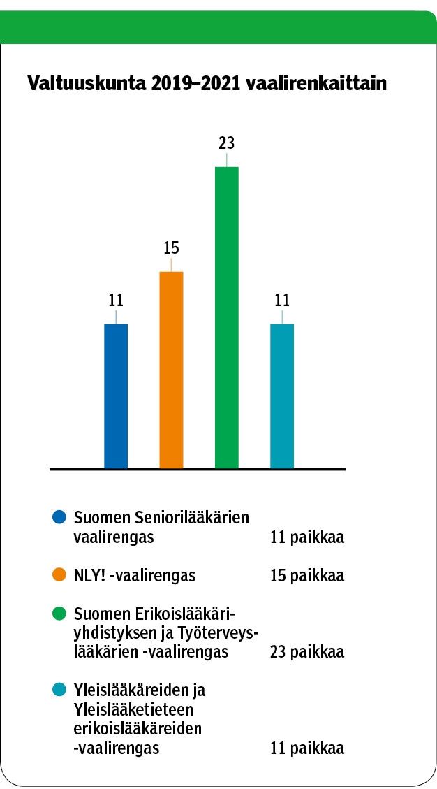 Suomen Erikoislääkäriyhdistyksen ja Työterveyslääkärien -vaalirengas sai uuteen valtuuskuntaan eniten paikkoja. NLY säilytti paikkansa toiseksi suurimpana ryhmänä. Martti Kekomäki oli ääniharava.