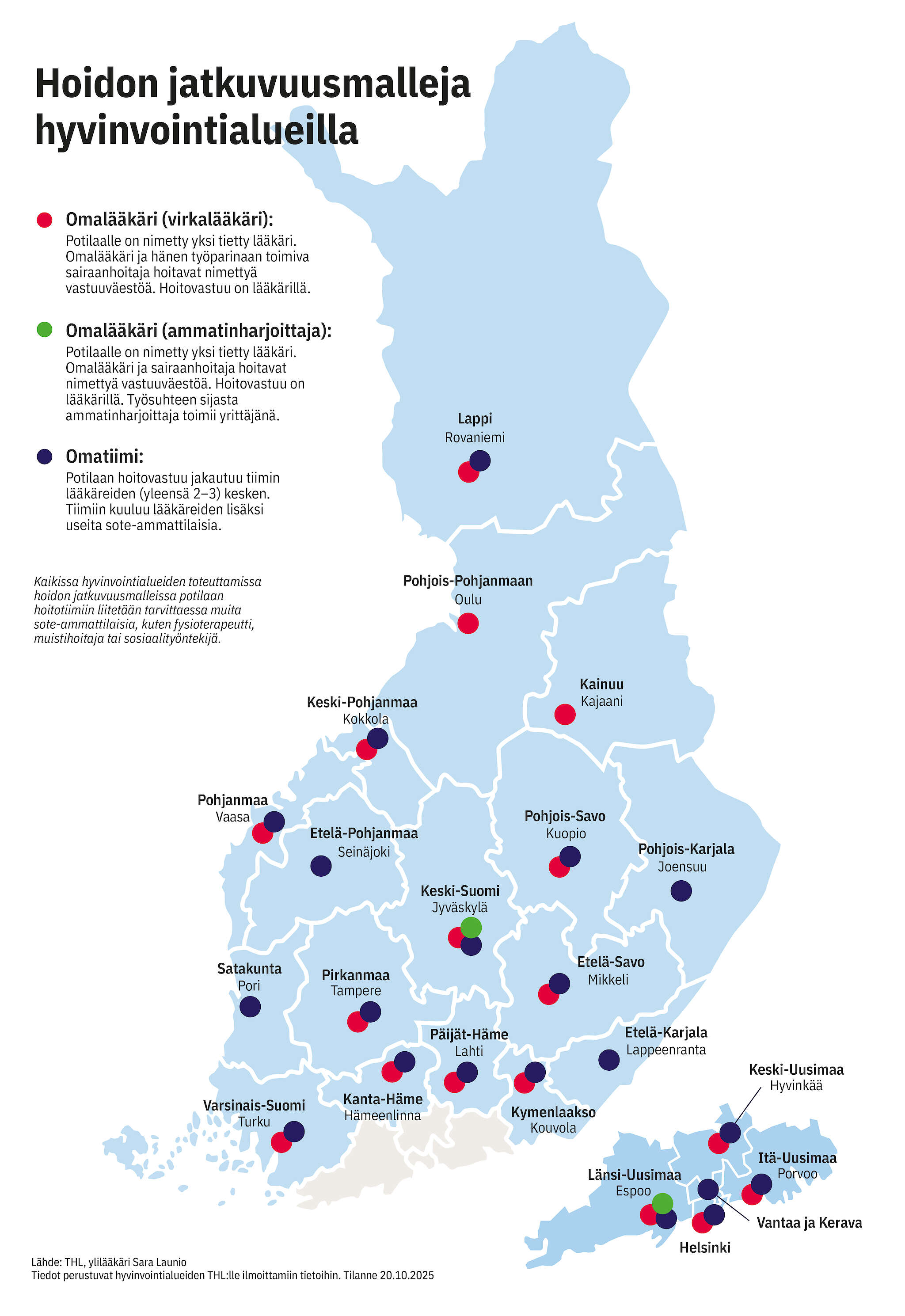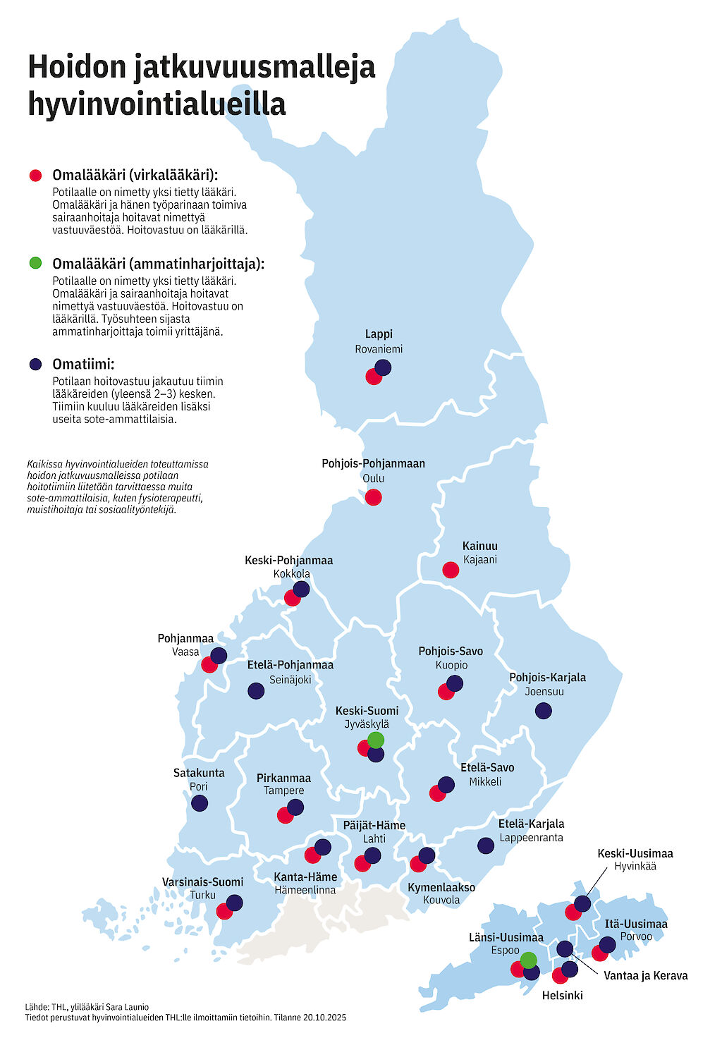 Muokattu karttakuvaa tiettyjen tiimi- ja omalääkärimallien osalta 20.20.2025 klo 16.20. Korjattu Pohjanmaan ja Etelä-Pohjanmaan sijainnit.