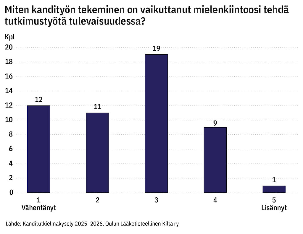 Kandityö on usealle ensimmäisen vuoden opiskelijalle ensikosketus akateemiseen kirjoittamiseen ja tutkimuksen tekoon. Mielenkiinto tutkimustyötä kohtaan tulevaisuudessa on vähentynyt suurimmalla osalla kyselyn vastaajista.