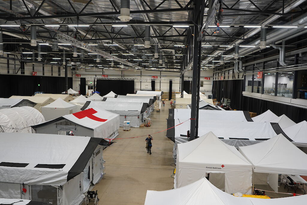 Tampereen Messukeskuksen halli on täynnä vaaleita telttoja. Niihin rakentuu Suomen Punaisen Ristin kenttäsairaala, joka lähetetään eri puolille maailmaa avuksi katastrofi- ja konfliktitilanteissa.