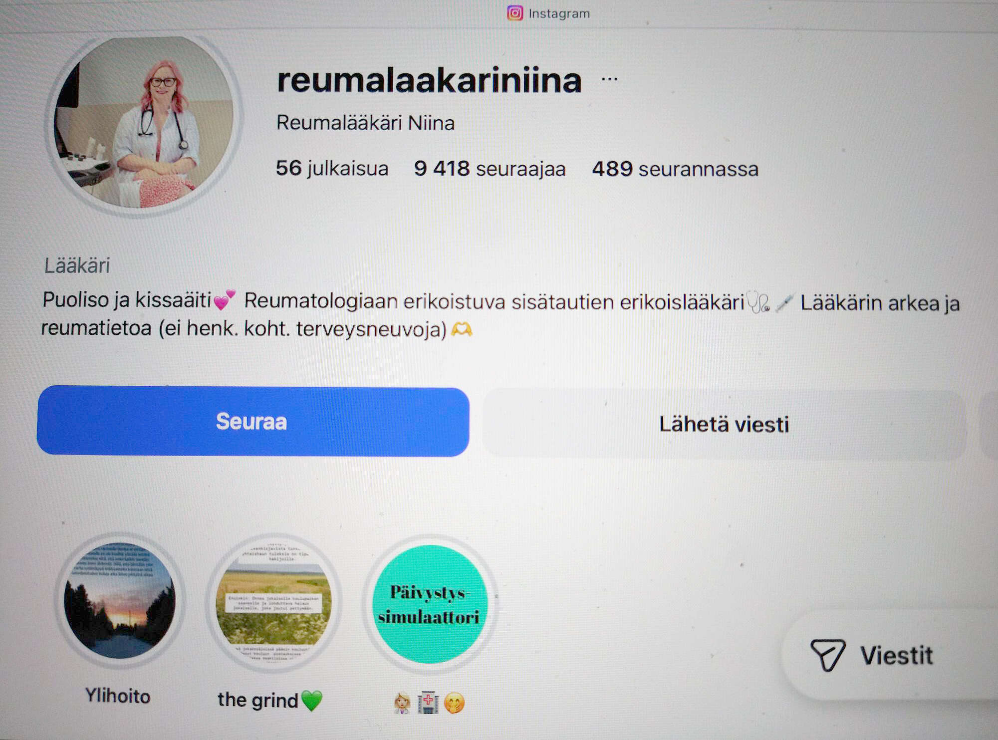 Reumatologiaan erikoistuva sisätautien erikoislääkäri Niina Vähäsaari Oysista aloitti reuma-aiheisen Instagramin Reumalääkäri Niina/@reumalaakariniina, koska hänellä on paljon sanottavaa alasta. Seuraajia on tullut jo yli 9 000.