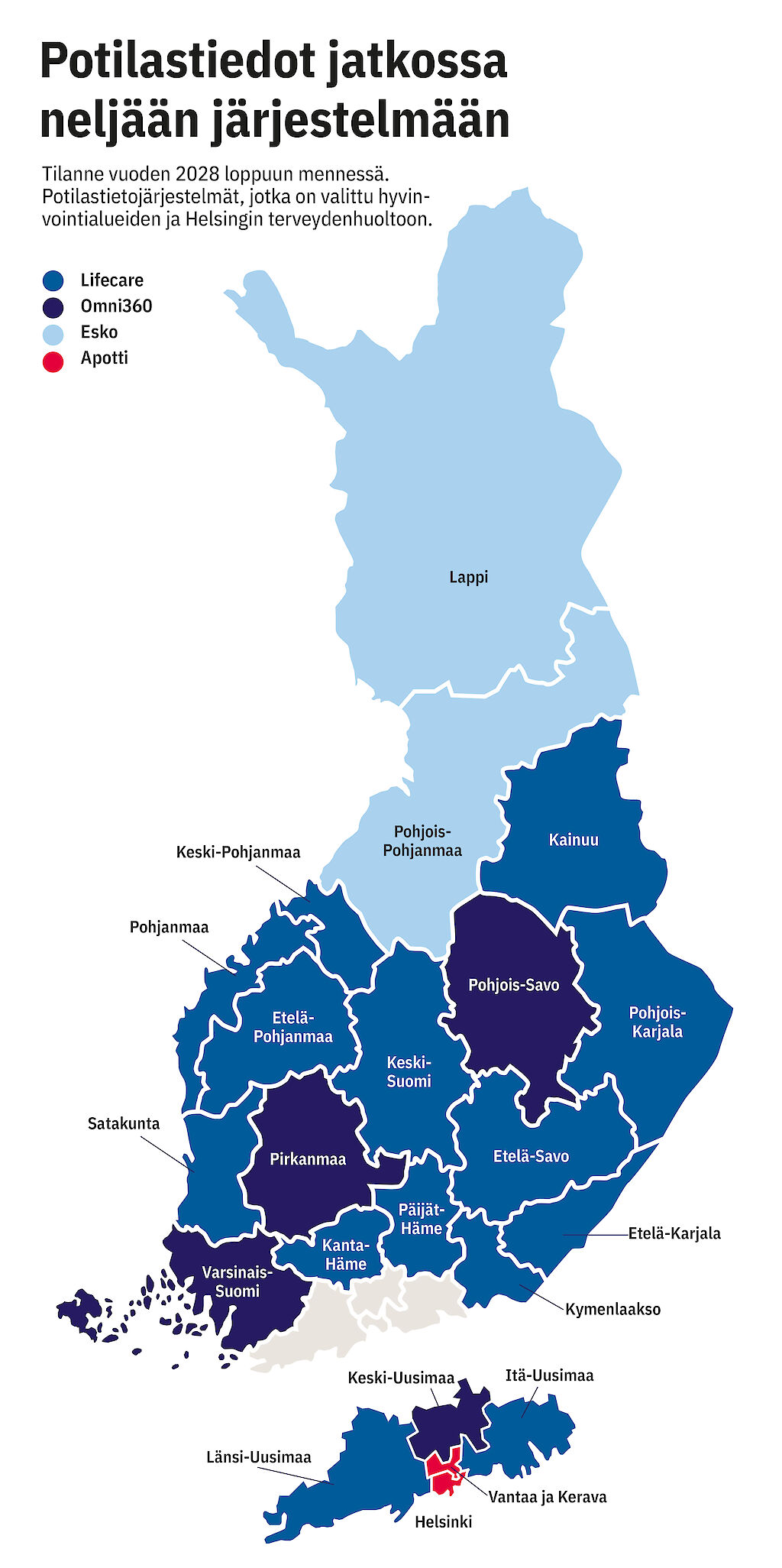 Länsi-Uusimaa: Tällä hetkellä käytössä Lifecare, Omni ja Mediatri. Apotti-käyttö on pääosin jo päättynyt. Lifecare korvaa muut järjestelmät kesään 2026 mennessä.