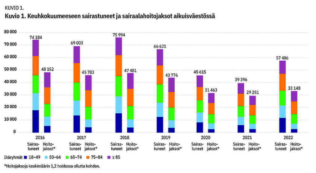 - Kolme neljästä hoitojaksosta (78 %) liittyi yli 64-vuotiaiden keuhkokuumeen hoitoon (keskipituus n. 10 päivää). Erot hyvinvointialueiden välillä olivat suuria.