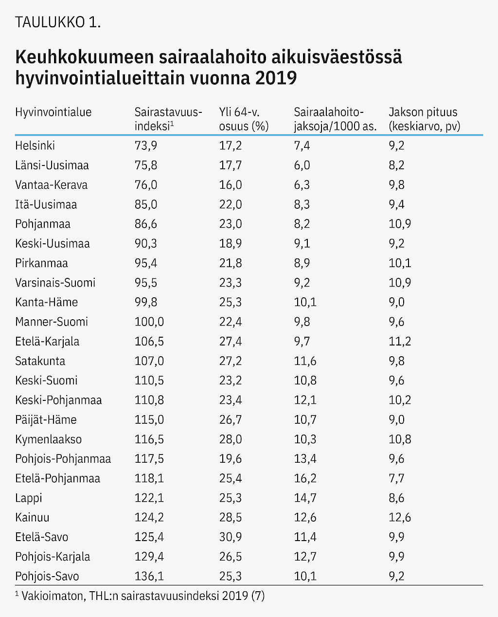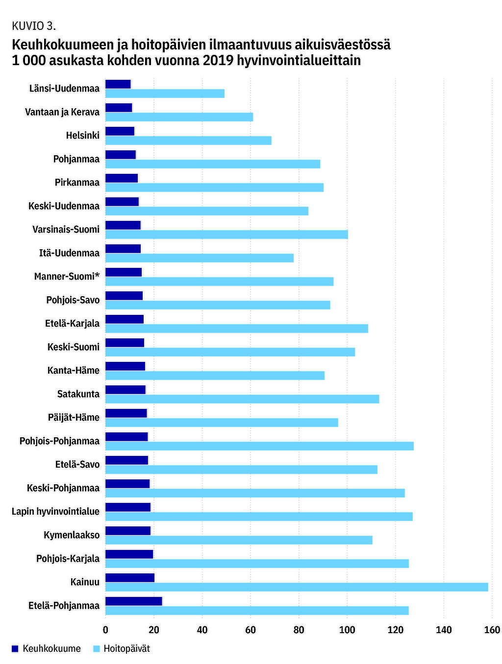 Asukaslukuun suhteutettuja hoitopäiviä vuonna 2019 oli eniten (> 125 / 1 000 asukasta) Kainuun, Pohjois- ja Etelä-Pohjanmaan, Pohjois-Karjalan ja Lapin hyvinvointialueilla (kuvio 3). Näistä sairastavuusindeksin viiden kärkeen sijoittuvat Pohjois-Karjala, Kainuu ja Lappi (taulukko 1). Vähiten hoitopäiviä (< 70 / 1 000 asukasta) oli pienimmän sairastavuuden alueilla eli Länsi-Uudenmaan, Vantaa-Keravan ja Helsingin kaupungin alueilla. Sairastuneiden, hoitopäivien ja hoitojaksojen määrät 1 000 asukasta kohti liittyivät selvästi alueen sairastavuuteen ja hieman heikommin yli 64-vuotiaan väestön osuuteen (liitetaulukko 3). Hoitojaksojen keskipituus oli suurin Kainuussa ja Etelä-Karjalassa koko aikuisväestössä ja etenkin 85 vuotta täyttäneillä (taulukko 1, liitetaulukko 2).