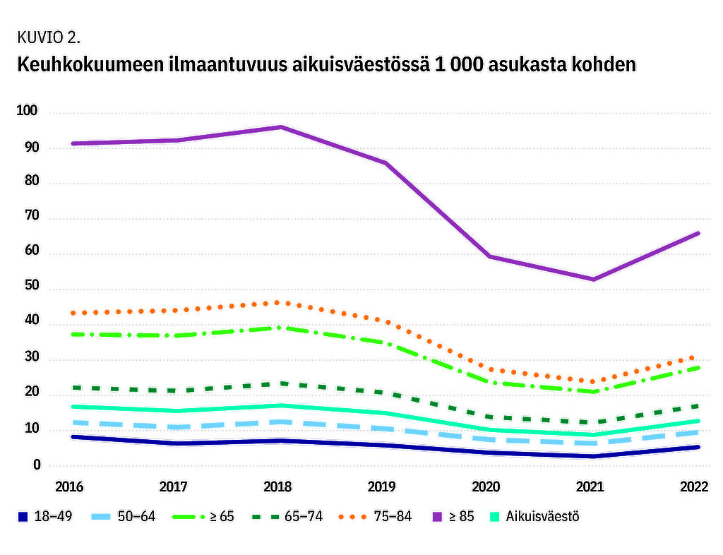 Vuosina 2016–2019 keuhkokuumeeseen sairastui vuosittain keskimäärin 71 450 aikuista (kuvio 1). Reilu puolet (58–64 %) sairastuneista oli yli 64-vuotiaita. Asukaslukuun suhteutettu ilmaantuvuus oli suurin 85 vuotta täyttäneillä (kuvio 2). Koko aikuisväestössä se vaihteli välillä 15–17 uutta tapausta 1 000 asukasta kohti. Vaikka sairastuneiden määrä laski koronavuosina (2020–2022: ka: 47 499 potilasta/vuosi), jakauma iän mukaan säilyi samankaltaisena.