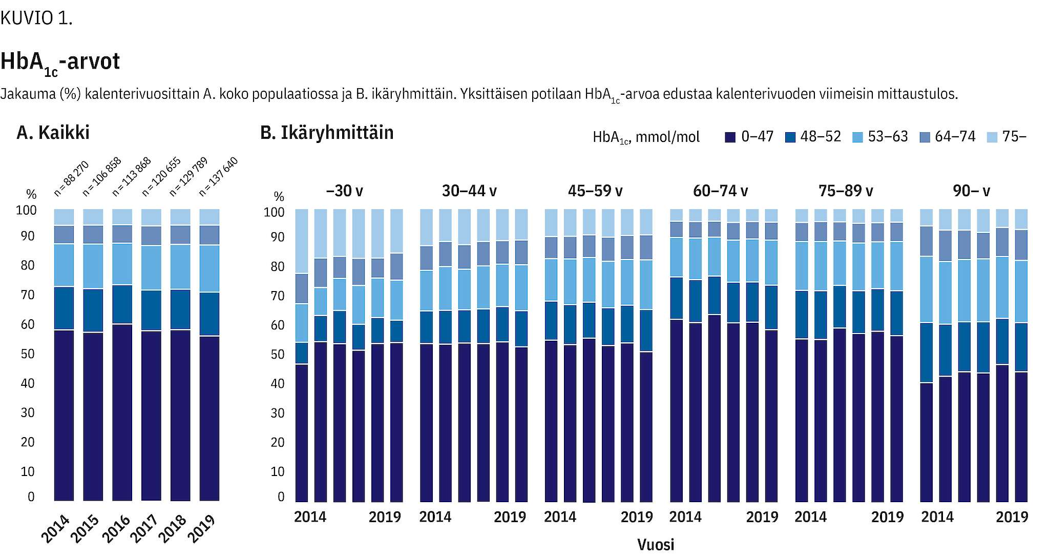 HbA1c-tason alle 53 mmol/mol saavutti 73,4 % vuonna 2014 ja 71,5 % vuonna 2019 (kuvio 1A). Seuranta-aikana näiden potilaiden osuus väheni selvimmin 45–74-vuotiaiden ikäryhmissä. 18–59-vuotiaista tämän tason saavutti selvästi harvempi kuin 60–89-vuotiaista (kuvio 1B).