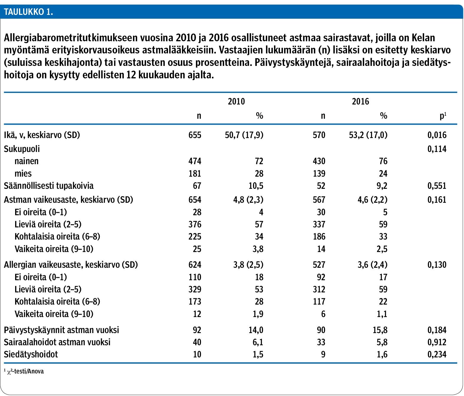 Vuonna 2010 henkilökunta haastatteli 1 114 asiakasta. Osallistujista 816 (73 %) ilmoitti sairastavansa lääkärin toteamaa astmaa ja 655:llä (59 %) oli erityiskorvausoikeus astmalääkkeisiin. Vuonna 2016 vastaajia oli 956, ja astmaa sairasti heistä 750 (78 %), allergista nuhaa 549 (57 %), atooppista ihottumaa 233 (24 %), ruoka-allergiaa 203 (21 %) ja allergista silmätulehdusta 195 vastaajaa (21 %). Erityiskorvausoikeus astmalääkitykseen oli 570:lla (60 %). Sekä vuoden 2010 että 2016 aineistossa naisia oli selvästi enemmän kuin miehiä ja vastaajat painottuivat vanhempiin ikäluokkiin (taulukko 1). Alle 18-vuotiaita oli vain 5 % vuonna 2016 ja 7 % vuonna 2010.