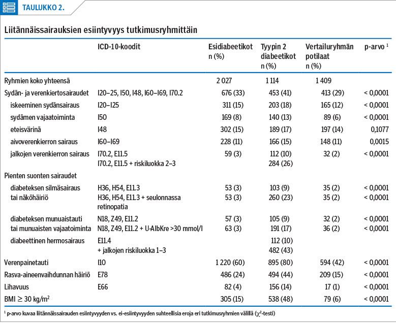 Esidiabeetikoiden, tyypin 2 diabeetikoiden, vertailuryhmään kuuluvien potilaiden ja väestön sukupuoli- ja ikäryhmäkohtaisten jakaumien samankaltaisuutta ryhmien välillä sekä eri tutkimusryhmien potilaiden ja heillä todettujen liitännäissairauksien ikäryhmäkohtaisten suhteellisten osuuksien eroja verrattiin χ2-testillä.