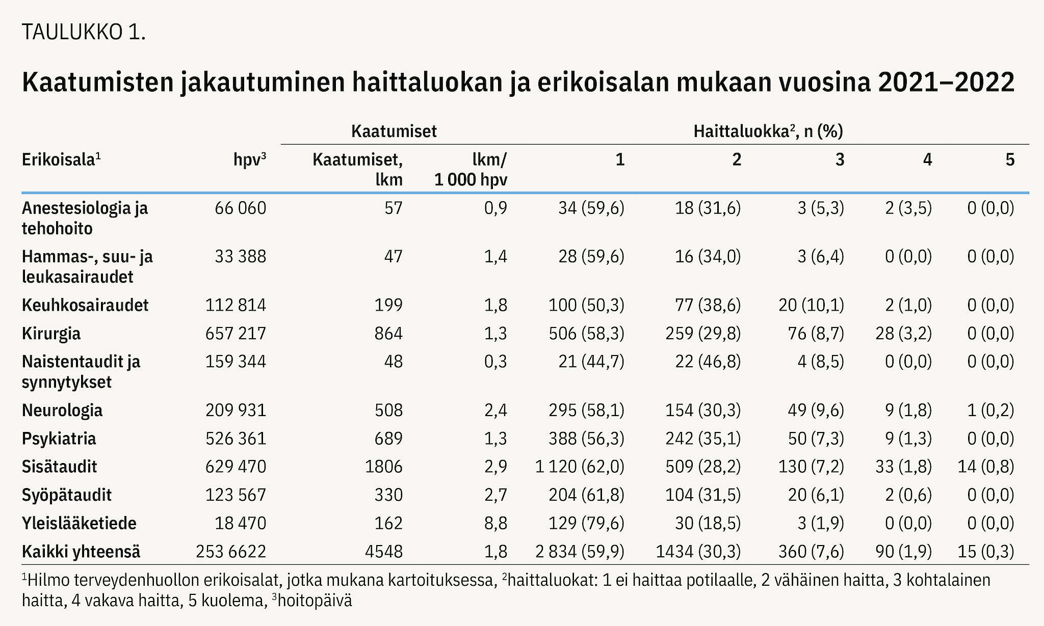 Kaatumisia tapahtui yhteensä 4 548, mikä tarkoittaa 1,8 kaatumista 1 000:ta hoitopäivää kohden. Suhteutettuna hoitopäiviin kaatumisia tapahtui eniten yleislääketieteen (8,8 per 1 000 hpv), sisätautien (2,9 per 1 000 hpv) ja syöpätautien (2,8 per 1 000 hpv) erikoisaloilla (taulukko 1). Kaatumisista 41 % (n = 1 880) aiheutti haittaa. Kaksi prosenttia kaatumisista aiheutti vakavan haitan. Anestesiologian ja tehohoidon (3,7 %), kirurgian (3,2 %) ja sisätautien (2,1 %) erikoisaloilla oli eniten vakavaksi haitaksi luokiteltuja kaatumisia. Kuolemaan johtaneita kaatumisia oli 15 (0,3 %), joista 14 tapahtui sisätautien ja yksi neurologian erikoisalalla (taulukko 1).