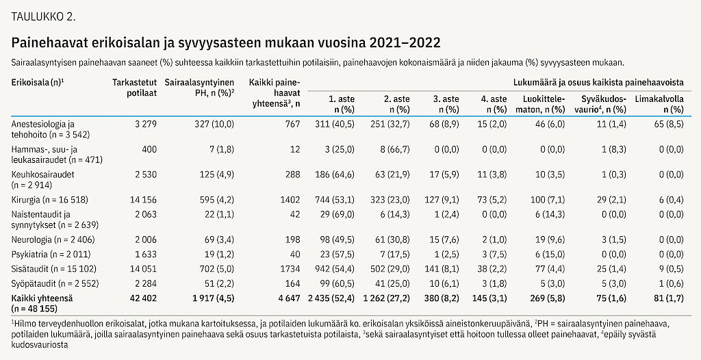 Koko aineistossa oli 4 647 painehaavaa ja 3 214 (7,6 %) potilasta, joista 1 917:llä (4,5 %) painehaava oli sairaalasyntyinen. Eniten potilaita, joilla oli sairaalasyntyinen painehaava, oli anestesiologian ja tehohoidon (10,0 %), sisätautien (5,0 %) ja keuhkosairauksien (4,9 %) erikoisaloilla. Koko aineistossa yli puolet (52,4 %) oli 1. asteen ja 38,5 % oli 2.–4. asteen painehaavoja (taulukko 2). Kaikista painehaavoista lääkintälaitteiden aiheuttamia oli 608 (13 %).