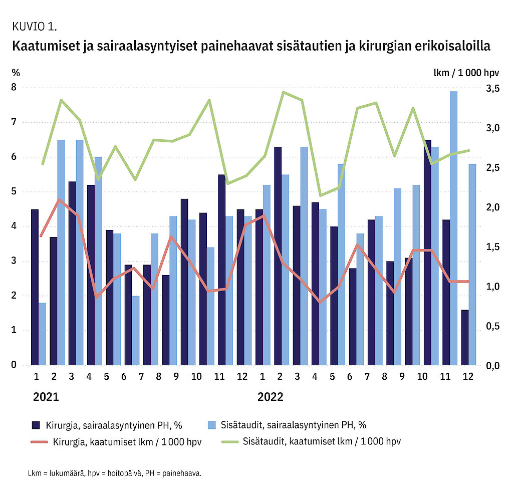 Menetelmät Retrospektiivinen aineisto kaatumisista ja painehaavoista muodostui yliopisto- (n = 5) ja keskussairaaloista (n = 6) kerätyistä tiedoista vuosilta 2021–2022. Tilastolliset vertailut toteutettiin lineaarisella sekamallilla.