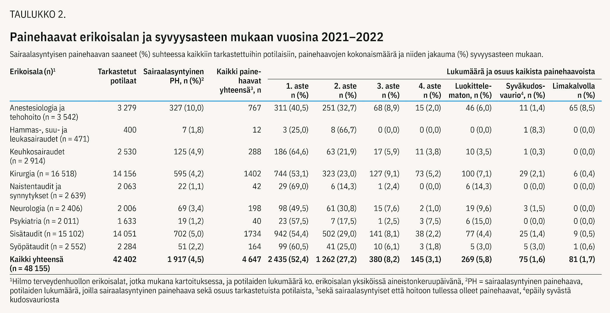 Koko aineistossa oli 4 647 painehaavaa ja 3 214 (7,6 %) potilasta, joista 1 917:llä (4,5 %) painehaava oli sairaalasyntyinen. Eniten potilaita, joilla oli sairaalasyntyinen painehaava, oli anestesiologian ja tehohoidon (10,0 %), sisätautien (5,0 %) ja keuhkosairauksien (4,9 %) erikoisaloilla. Koko aineistossa yli puolet (52,4 %) oli 1. asteen ja 38,5 % oli 2.–4. asteen painehaavoja (taulukko 2). Kaikista painehaavoista lääkintälaitteiden aiheuttamia oli 608 (13 %).