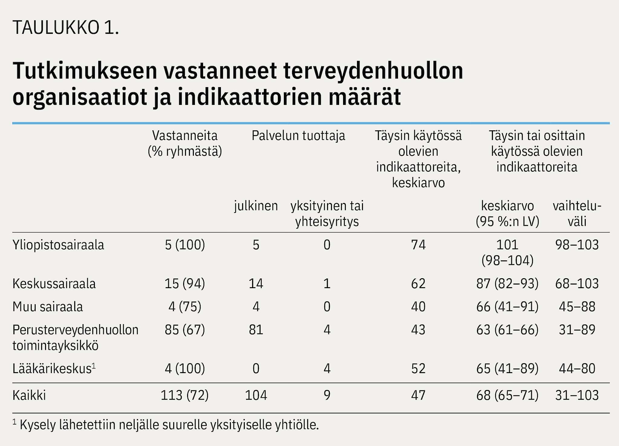 Kysytyt indikaattorit olivat yleisimmin käytössä (keskiarvo kyllä- ja osittain-vastauksien summasta sulkeissa) yliopistosairaaloissa (101) ja keskussairaaloissa (87). Muiden sairaaloiden (66), lääkärikeskusten (65) ja julkisen perusterveydenhuollon toimintayksiköissä (63) määrät olivat keskenään samalla tasolla. Ryhmien sisällä havaittiin jopa lähes kolminkertaisia eroja (taulukko 1 ja kuvio 1).