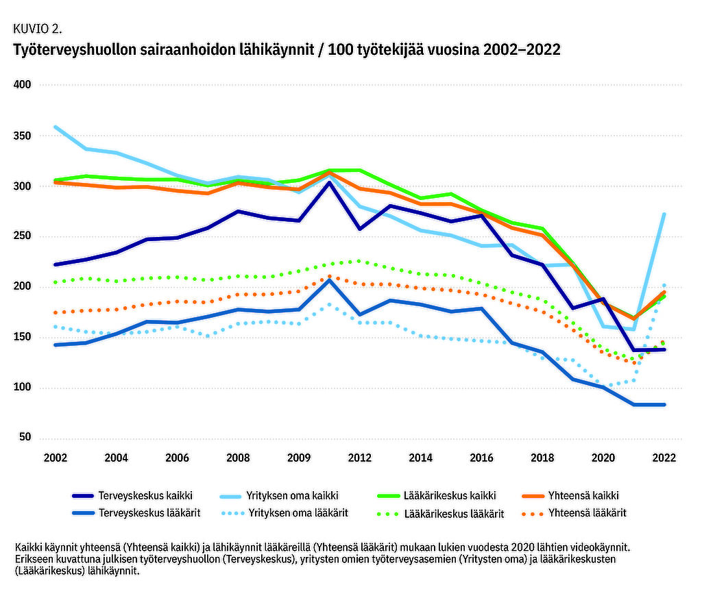 Sairaanhoidon lähikäyntien, 2020 lähtien myös videokäyntien, lukumäärät 100 työntekijää kohti on esitetty kuviossa 2. Vuonna 2002 käytiin eniten omilla työterveysasemilla (3,6 käyntiä/työntekijä), hieman vähemmän lääkärikeskuksissa (3,1) ja vähiten terveyskeskuksissa (2,2). Käyntimäärät vähenivät merkitsevästi vuodesta 2002 vuoteen 2022 kaikilla palveluntuottajilla, ja olivat tällöin 2,7 käyntiä työntekijää kohti omilla työterveysasemilla (ilmaantuvuustiheyssuhde (IRR) 1,217; 95 %:n luottamusväli (LV) 0,884–1,673), lääkärikeskuksissa 1,9 (IRR 0,624; LV 0,498–0,782) ja terveyskeskuksissa 1,4 (IRR 0,997; LV 0,725–1,371). Tulokset esitetty liitetaulukossa 1.