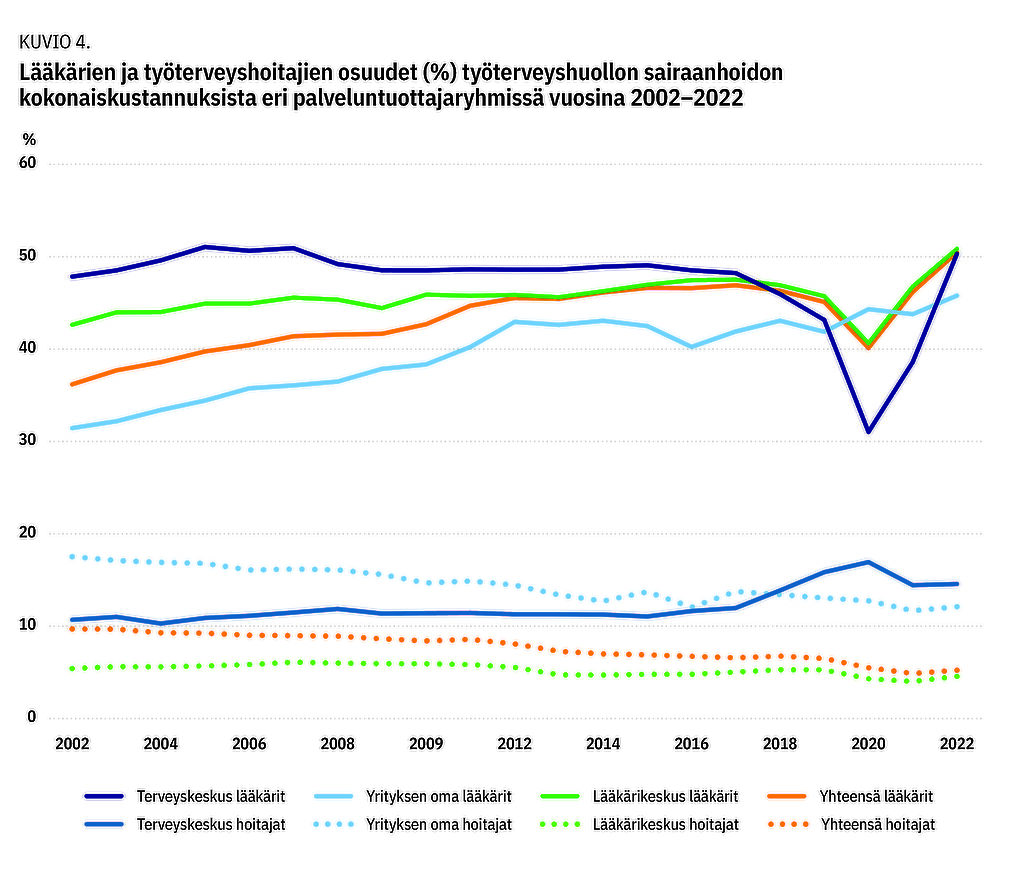 Results The share of workers receiving their services from private medical centers increased from 32 % to almost 90 % during the follow-up period. At the same time, the share of physicians in service production increased. The number of appointments started to decrease after 2010, turning to a slight increase in 2022. The cost increase leveled off after 2010, especially compared to the number of people and value for money.