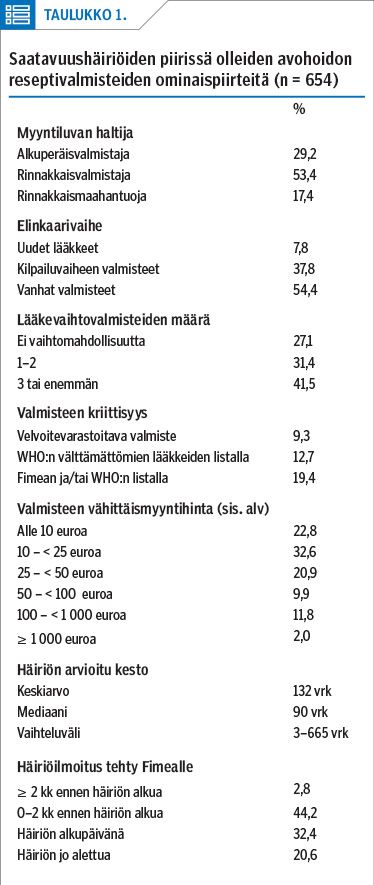 Yli vuoden pituisiksi arvioitujen häiriöiden osuus avohoidon reseptivalmisteiden saatavuushäiriöistä oli 7,8 %. Rinnakkaisvalmisteiden saatavuusongelmien arvioidut kestot olivat keskimäärin pidempiä kuin alkuperäisvalmisteiden ja rinnakkaismaahantuontien (ka 154 vrk vs. 102 vrk alkuperäisvalmisteilla ja 114 vrk rinnakkaistuonneilla). Vain pieni osa (3 %) häiriöilmoituksista oli tehty Fimealle lääkelain määrittämää kahta kuukautta ennen myynnin keskeyttämistä; noin puolet ilmoituksista oli tehty vasta häiriön alkamispäivänä tai sen jälkeen.