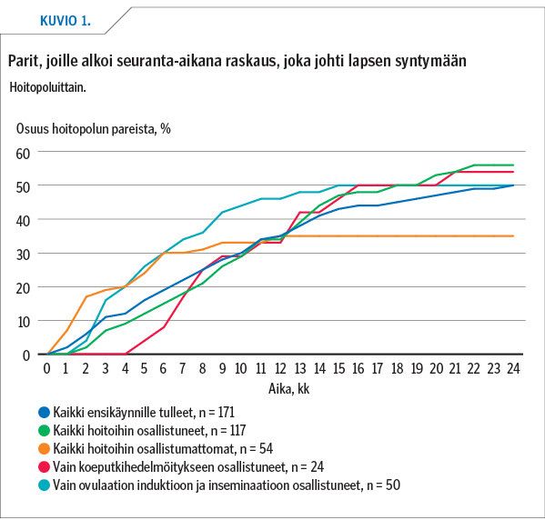 Tulokset Puolet ensikäynnille tulleista pareista ja 56 % hoidetuista sai lapsen. Onnistunut raskaus alkoi useimmiten koeputkihedelmöityksellä (40 %), mutta myös spontaanit ja ovulaation induktiosta alkaneet raskaudet olivat yleisiä (29 %, 26 %). Raskauden alkamiseen kului keskimäärin 9 kuukautta ensikäynnistä. Kolmasosa pareista ei osallistunut hoitoihin ja 18 % keskeytti hoidot.