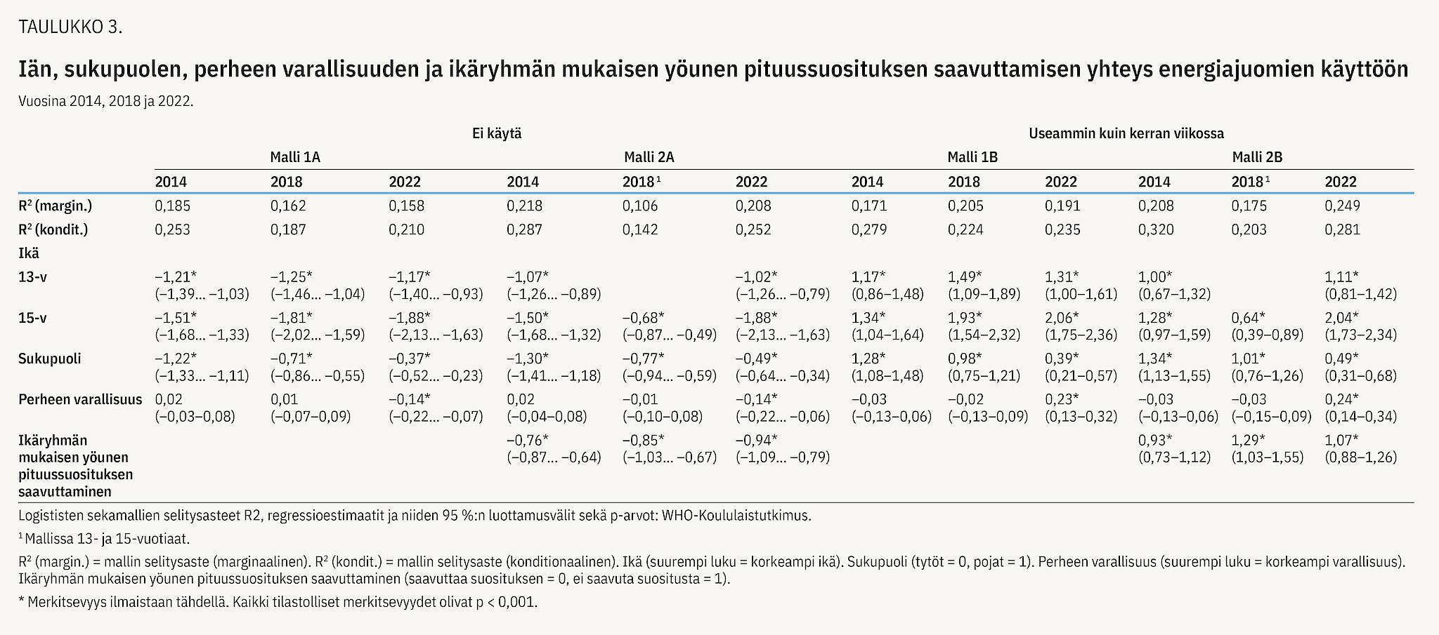 Perheen varallisuus oli yhteydessä käyttöön vain 2022, jolloin korkeamman varallisuuden perheissä lapset ja nuoret käyttivät energiajuomia muita yleisemmin. Kun tarkasteluun lisättiin suositusten mukainen yöunen pituus, useammin kuin kerran viikossa tapahtuva energiajuomien käyttö oli kaikkina tarkasteluvuosina yleisempää niillä lapsilla ja nuorilla, jotka eivät yltäneet ikäryhmänsä mukaiseen yöunen pituussuositukseen (taulukko 3, malli 2B). Lisäksi iän, sukupuolen ja perheen varallisuuden roolit selittäjinä säilyivät.