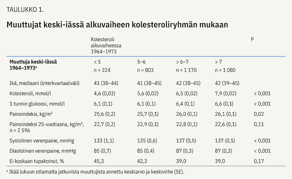 Aineiston lähtövaiheen tietoja on taulukossa 1. Ensimmäisen käynnin mediaanivuosi oli 1968 (vaihteluväli 1964–1973). Ensimmäisessä mittauksessa iän mediaani oli 42 vuotta (interkvartaaliväli 38–45), sen osalta kolesteroliryhmät olivat verrannolliset. Kolesterolin lisäksi riskitekijöissä todettiin merkitsevät ikävakioidut erot ryhmien välillä.