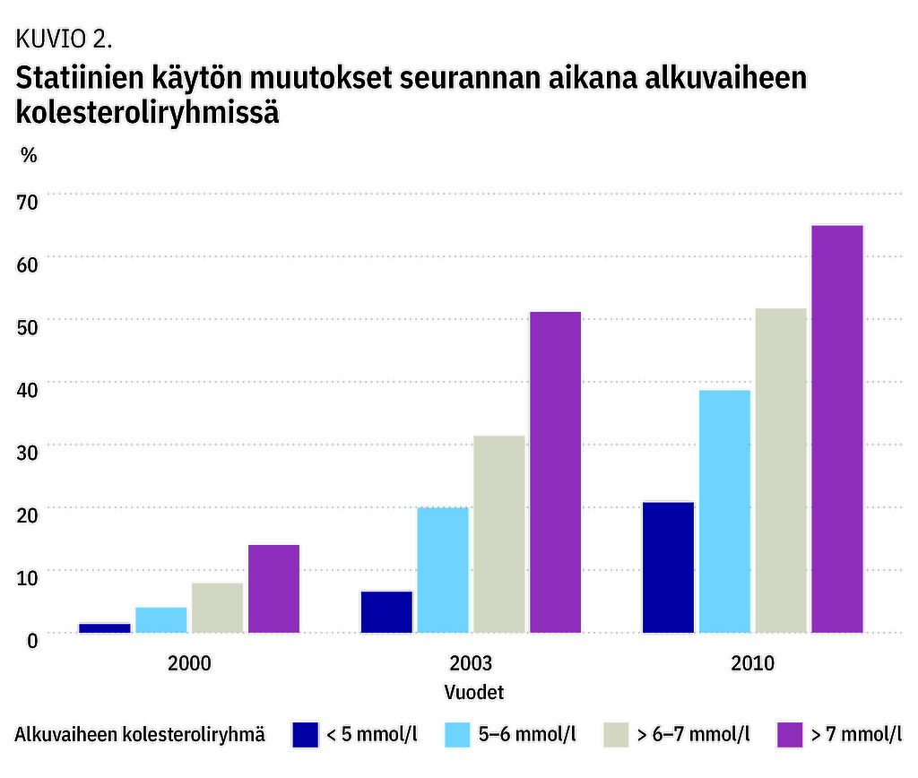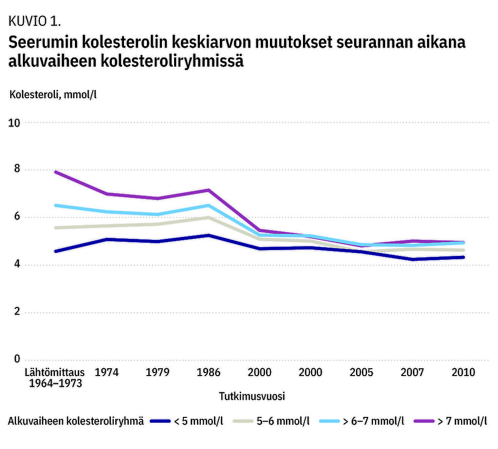Kolesterolipitoisuuden kehitys seurannan aikana on kuviossa 1. Kun matalimman kolesterolitason ryhmän keskiarvo pysytteli 5 mmol/l:ssa, muissa ryhmissä keskiarvo pieneni selvästi vuoden 2000 jälkeen. Tähän vaikuttivat kuolemien aiheuttama valikoituminen ja yleinen väestötason muutos (19). Taustalla oli epäilemättä myös statiinilääkityksen yleistyminen 2000-luvulla, etenkin ryhmissä, joissa lähtövaiheen kolesterolitaso oli korkea (kuvio 2).