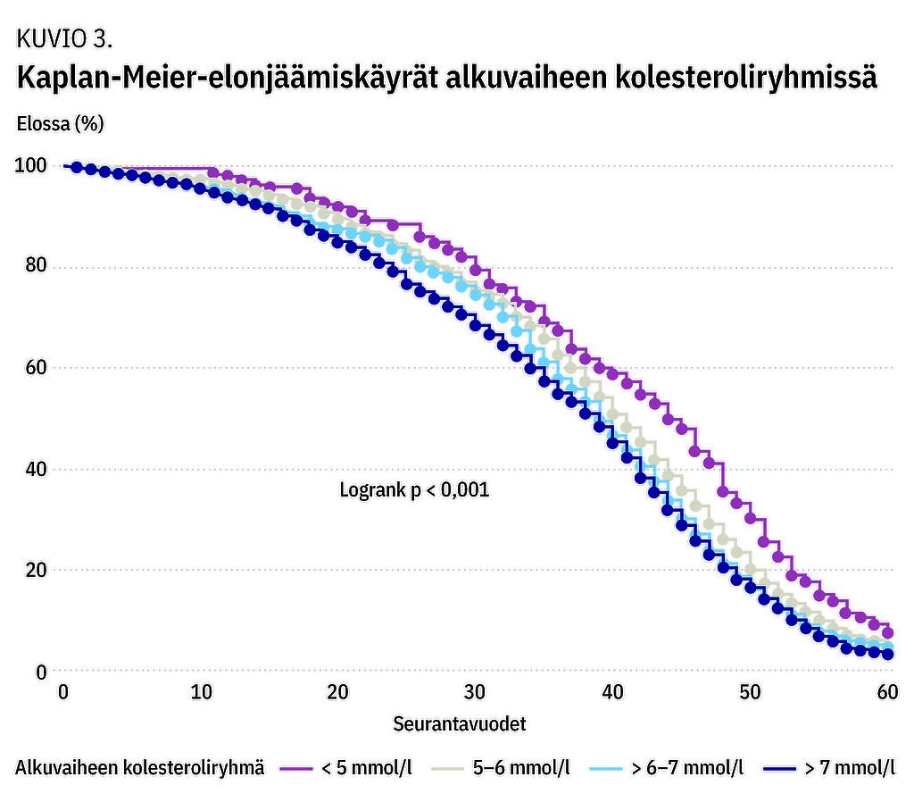 Seuranta-ajan (kuolemaan tai 31.1.2025 saakka) mediaani oli 40 vuotta (vaihtelu 1–61 vuotta). Koko seuranta-aikana miehistä kuoli 93,6 % (n = 3 068), alkuvaiheen ryhmissä pienimmästä kolesterolipitoisuudesta suurimpaan 88,4 %, 92,7 %, 93,9 % ja 95,1 % (p = 0,001).