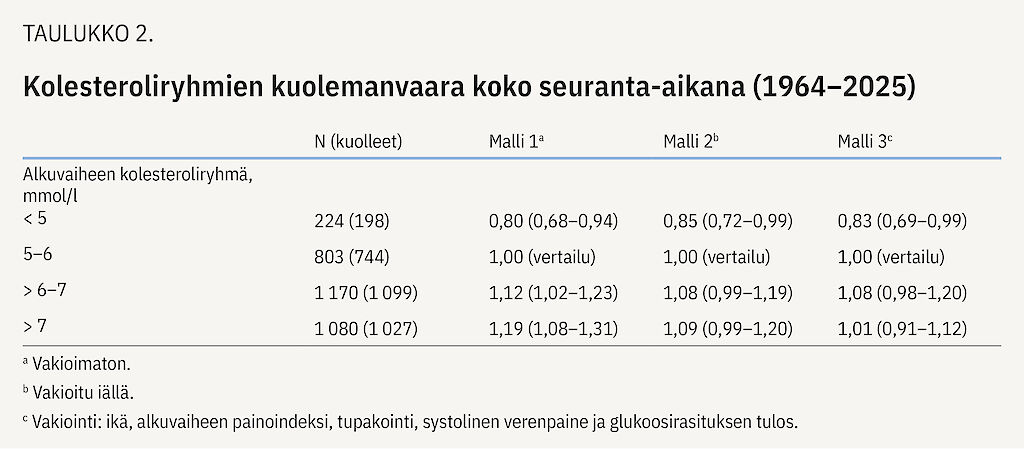 Kolesteroliryhmien kuolleisuutta koko seuranta-aikana vertailtiin Coxin regressioanalyysilla (taulukko 2). Kun alkuvaiheen kolesteroliryhmän 5–6 mmol/l riskisuhde oli 1,0, alle 5 mmol/l:n ryhmällä oli muilla riskitekijöillä vakioituna 17 % (riskisuhde 0,83, 95 %:n LV 0,69–0,99) pienempi kuolemanvaara. Jatkuvana muuttujana alkuvaiheen kolesterolin riskisuhde (per 1 SD ja riskitekijöillä vakioituna) oli 1,04 (95 %:n LV 1,003–1,08; p = 0,037).