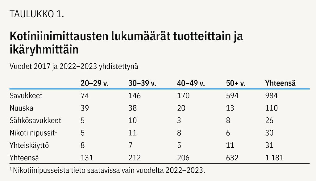 Terve Suomen poimintaan otettiin mukaan myös henkilöitä, jotka käyttivät päivittäin jotain muuta tuotetta kuin savukkeita (nuuskaa, sähkösavukkeita, nikotiinipusseja, kuumennettavaa tupakkaa tai nikotiinikorvaushoitotuotetta). Tämä tieto kerättiin välillä 9/2022–3/2023 alle 75-vuotiailta osallistujilta, kun tupakointistatustieto ja kotiniinipoiminnat kerättiin välillä 1/23–6/23. FinTerveys-tutkimuksesta valikoituivat mukaan muiden tuotteiden kuin savukkeiden käyttäjät tupakointistatuksen perusteella.