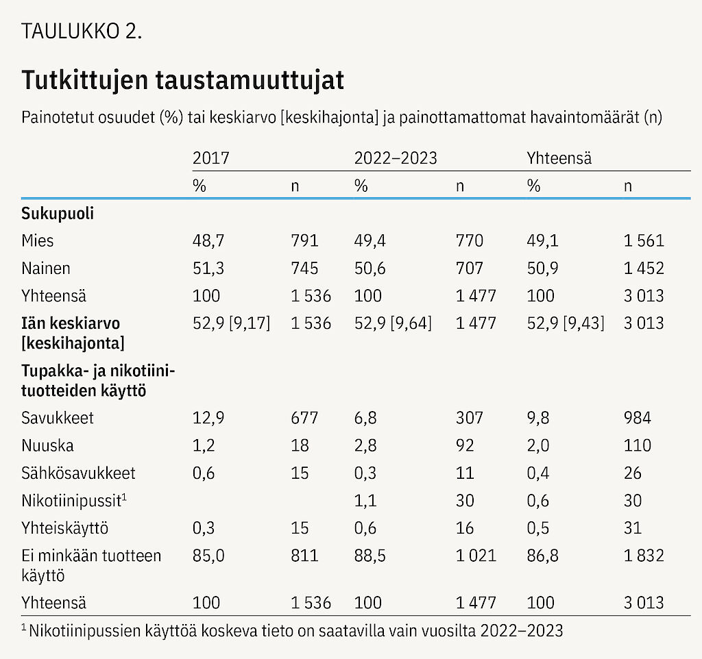 Naisia oli aineistossa 51 prosenttia, ja osallistujien keski-ikä oli vajaa 53 vuotta. Savukkeiden ja nuuskan käyttäjiä oli aineistossa enemmän kuin muiden tuotteiden käyttäjiä (taulukko 2).