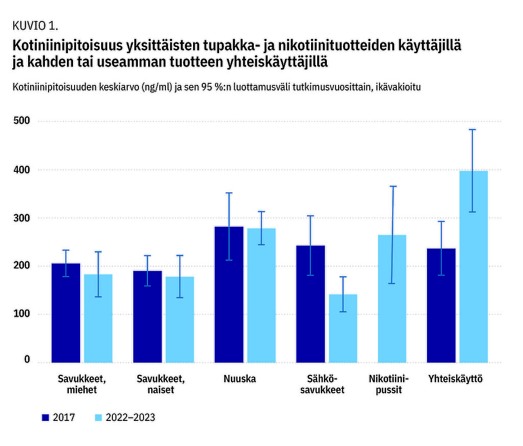 Menetelmät Aineistona olivat aikuisilta kahden väestötutkimuksen ohessa kerätyt veren kotiniiniarvot vuosilta 2017 (n = 1 543 näytettä) ja 2022–2023 (n = 1 599 näytettä). Keskimääräisiä kotiniinitasoja verrattiin regressioanalyysilla ainoastaan savukkeita, nuuskaa, nikotiinipusseja ja sähkösavukkeita päivittäin käyttävillä (n = 1 150) sekä tuotteiden yhteiskäyttäjillä (n = 31). Plasman kotiniiniarvoja verrattiin suhteessa viimeisimpään savukkeiden käyttökertaan.