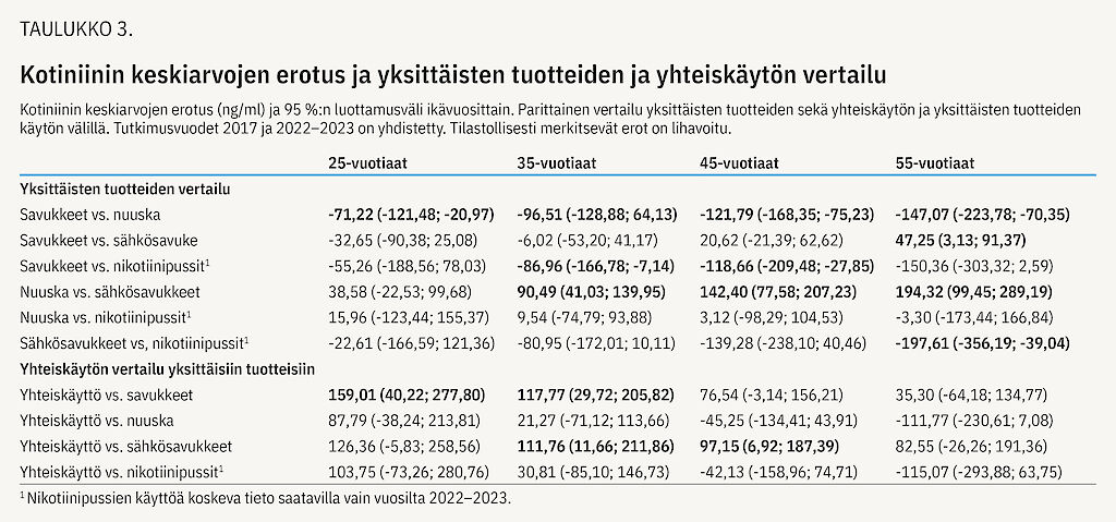 Nuuskaa käyttävien kotiniinitasot olivat korkeammat kuin savukkeita polttavien kaikissa tarkastelluissa ikäryhmissä, ja nikotiinipusseja käyttävien puolestaan savukkeita polttavia korkeammat kahdessa keskimmäisessä ikäryhmässä (taulukko 3). Savukkeiden ja sähkösavukkeiden sekä sähkösavukkeiden ja nikotiinipussien käyttäjien kotiniinitasoissa ei pääsääntöisesti havaittu eroa. Myöskään nuuskan ja nikotiinipussien käyttäjien kotiniinitasoissa ei havaittu eroja, kun taas nuuskaa käyttävien kotiniinitasot olivat korkeammat kuin sähkösavuketta käyttävien lukuun ottamatta nuorinta ikäryhmää. Yhteiskäyttäjien kotiniinitasot olivat korkeammat kuin savukkeiden polttajilla nuorimmissa ryhmissä ja korkeammat kuin sähkösavukkeita käyttävillä 35- ja 45-vuotiailla.