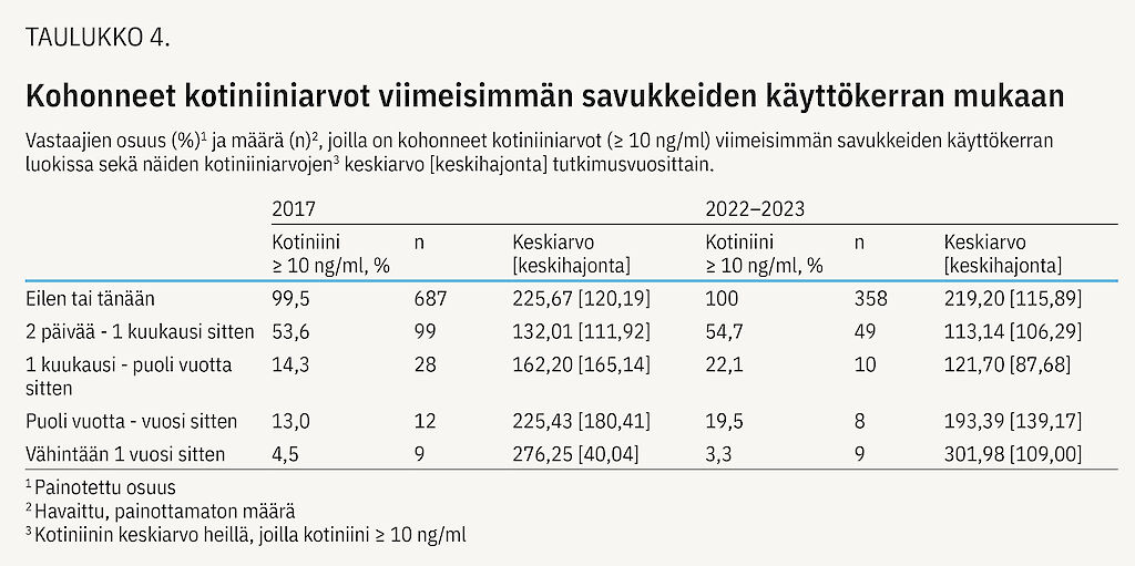Molempina tutkimusvuosina ”eilen tai tänään ” savukkeita polttaneilla oli selvästi suurimmat kotiniiniarvot (taulukko 4). Muihinkin ryhmiin luokittuvilla havaittiin kohonneita kotiniinitasoja, siten että arvot olivat koholla runsaalla puolella heistä, joilla viimeisestä savukkeesta oli 2–30 päivää. Yli kuukauden mutta alle vuoden sisällä tupakoineista joka viidennellä oli aktiivitupakointia osoittava kotiniiniarvo vuosina 2022–2023.