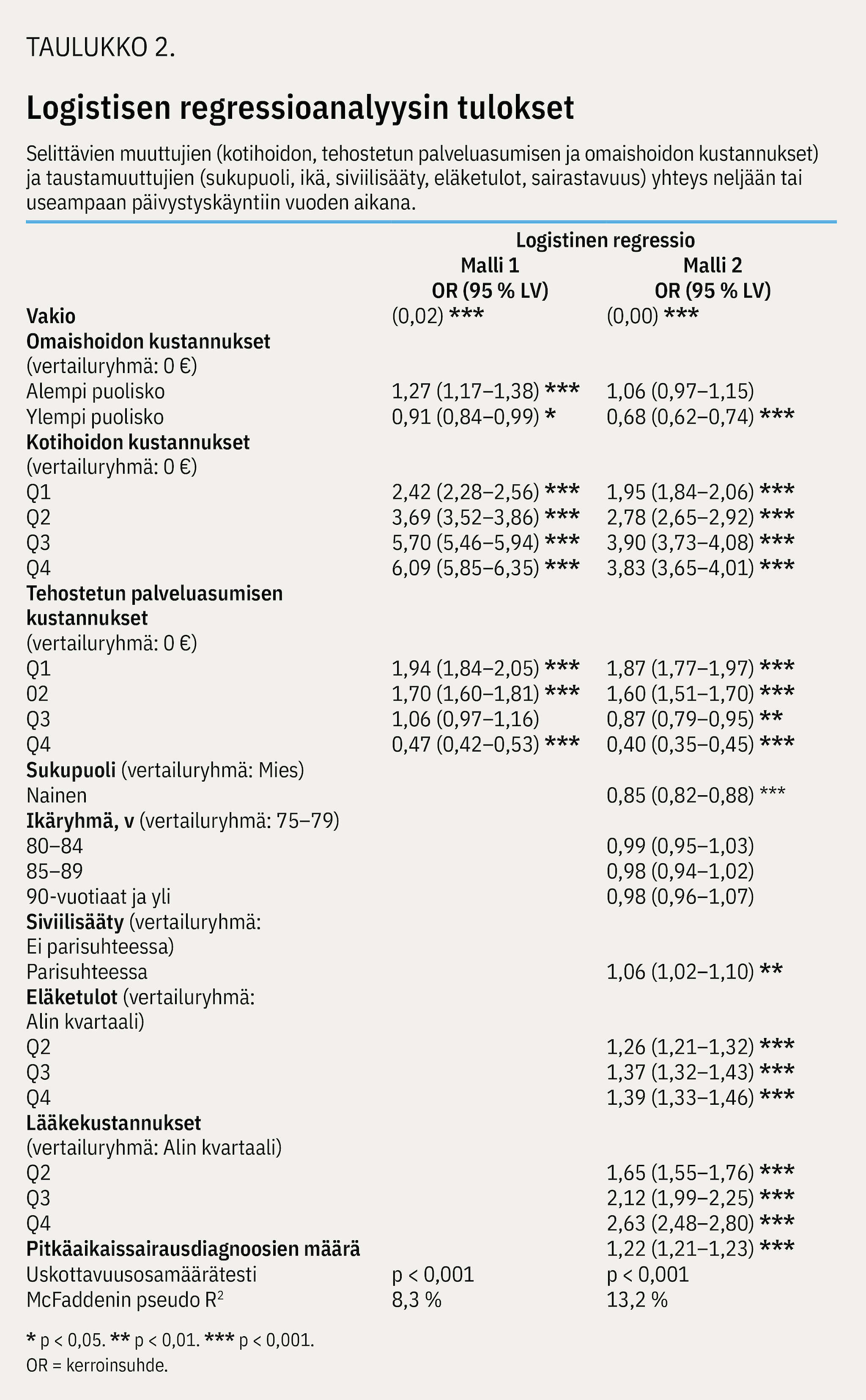 Logistisen regressioanalyysi tehtiin kahdessa vaiheessa. Ensimmäisessä vaiheessa mallissa oli mukana tehostetun palveluasumisen, kotihoidon ja omaishoidon kustannukset. Toisessa vaiheessa malli vakioitiin taustamuuttujilla sekä sairastavuutta ja sosioekonomista asemaa mittaavilla muuttujilla. Mallien tilastollista suoriutumista arvioitiin uskottavuusosamäärätestillä ja McFaddenin pseudo R² -luvulla.