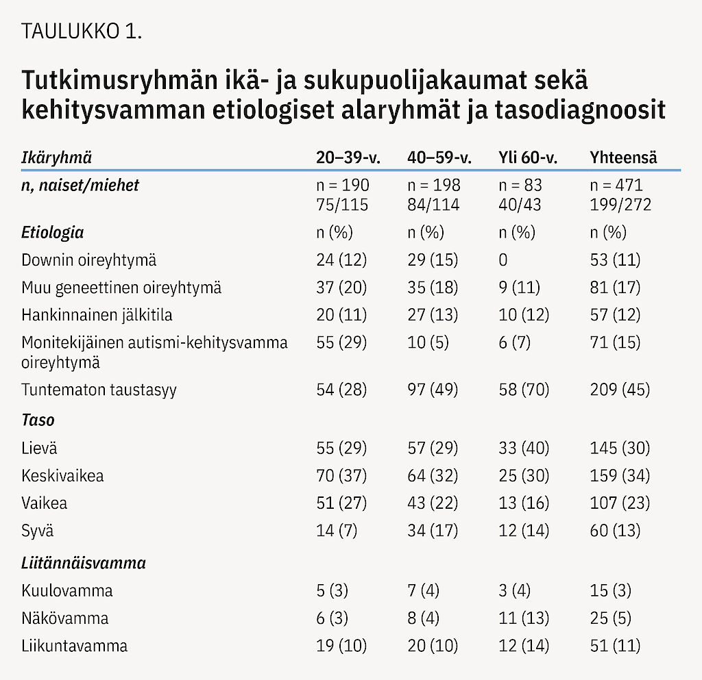 Tutkimuskohortissa oli 471 henkilöä, 272 miestä ja 199 naista (58 % vs 42 %), ja ikäjakauma oli 20–93 vuotta. Miesten mediaani- ja keski-ikä olivat kumpikin 44 vuotta; naisten vastaavat luvut olivat 46 ja 45 vuotta. Valtaosa tutkimushenkilöistä, 451, asui vakituisesti ja 20 tilapäisesti palvelukodissa. Tutkimuskohortti jaettiin kolmeen ikäluokkaan: 20–39-vuotiaat, 40–59-vuotiaat ja 60 vuotta täyttäneet. Taulukossa 1 esitetään näiden kolmen ikäryhmän jakautuminen sukupuolen, kehitysvamman etiologian, kehitysvamman tason ja liitännäisvammojen mukaan. Kahdessa nuoremmassa ikäryhmässä miehiä oli lukumääräisesti enemmän, kun taas vanhimmassa naisia ja miehiä oli lähes yhtä monta.