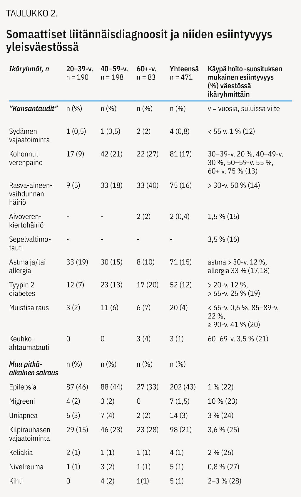 Tutkimuskohortilta (n = 471) selvitettiin etiologiset diagnoosit, tasodiagnoosit, pitkäaikaiset somaattiset liitännäissairaudet ja -vammat, voimassa olevat lääkitykset sekä tupakointi. Lisäksi 122 tutkimushenkilön painoindeksi määritettiin. Vertasimme tuloksia Käypä hoito -suosituksissa esitettyihin pitkäaikaissairauksien esiintyvyyslukuihin aikuisilla (12,13,14,15,16,17,18,19,20,21,22,23,24,25,26,27,28,29).