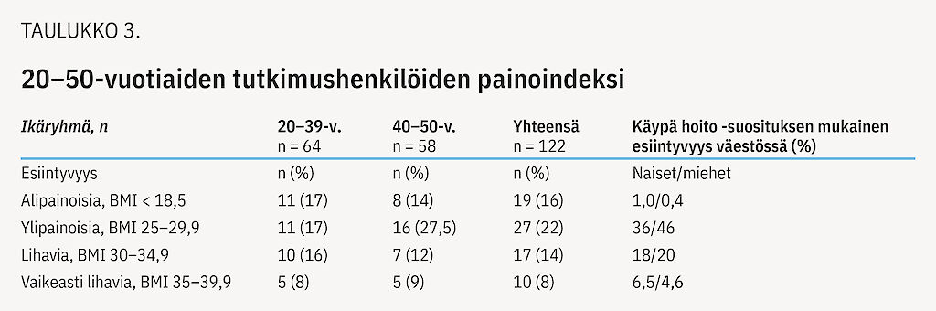Taulukossa 3 esitetään 122 tutkittavan painoindeksi. Heistä alipainoisia (BMI < 18,5) oli 16 %, mikä on moninkertainen esiintyvyys verrattuna koko väestöön. Vaikeasti lihavia (BMI 35+) oli yhtä paljon kuin koko väestössä. Alipainoisista henkilöistä 74 % oli syvästi tai vaikeasti kehitysvammaisia ja liikuntavammaisia, kun taas vaikeasti lihavien joukossa kaikki olivat lievästi kehitysvammaisia, ja heistä 50 % käytti psykoosilääkettä ja 33 % tyroksiinia.